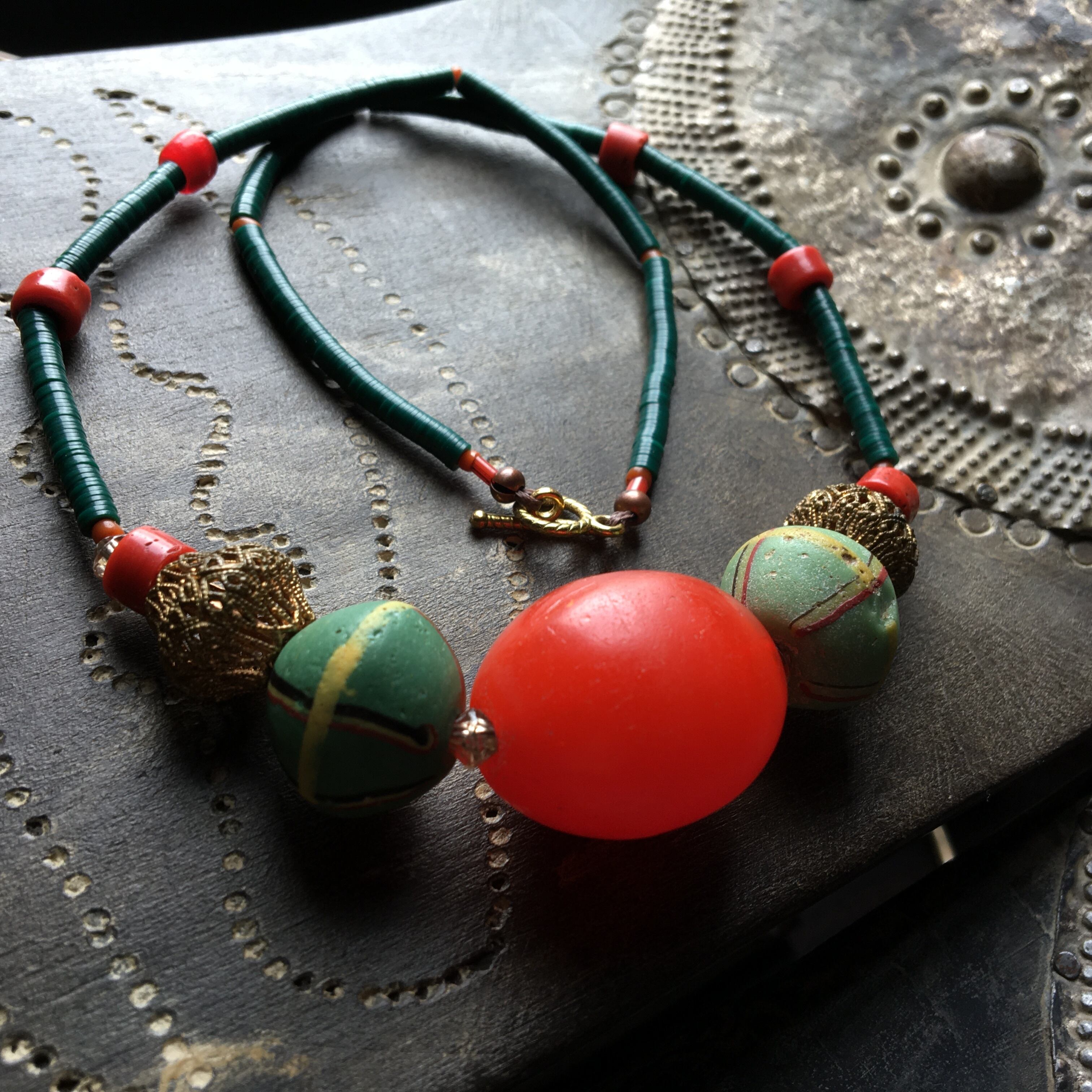 1900年代ボヘミア徳田チェリーにアフリカンアンティークトレードkingビーズ、ビンテージゴールドメタルビーズ、アンティークレコード盤ビーズを使用したワイルドで重量感あるネックレス作品。