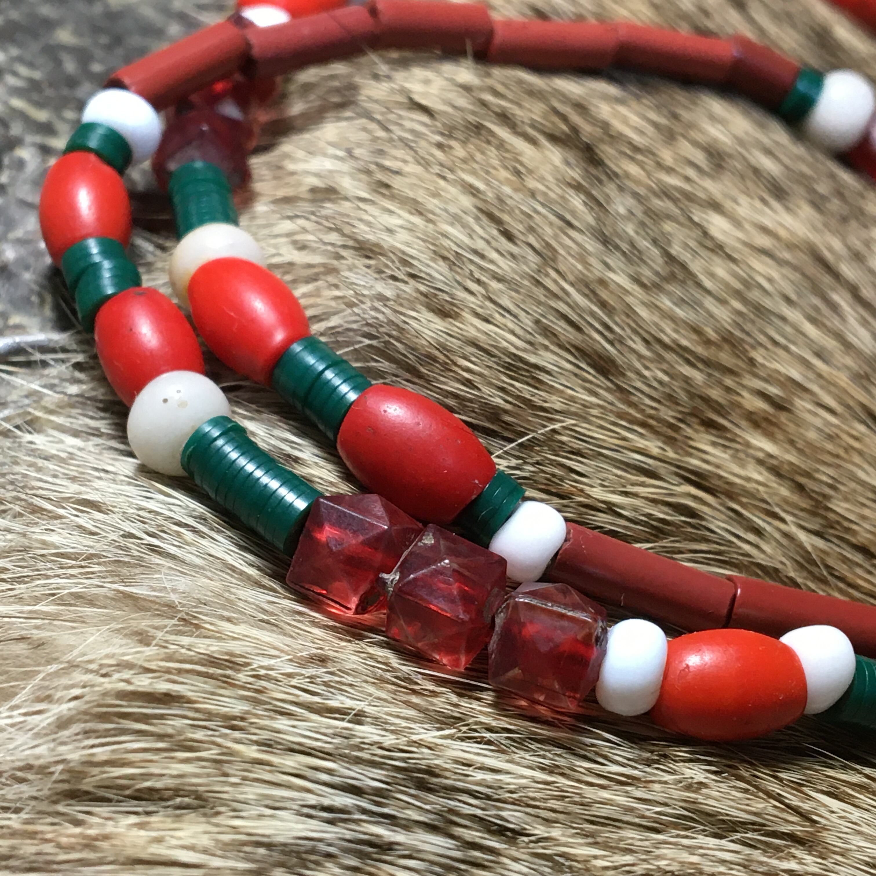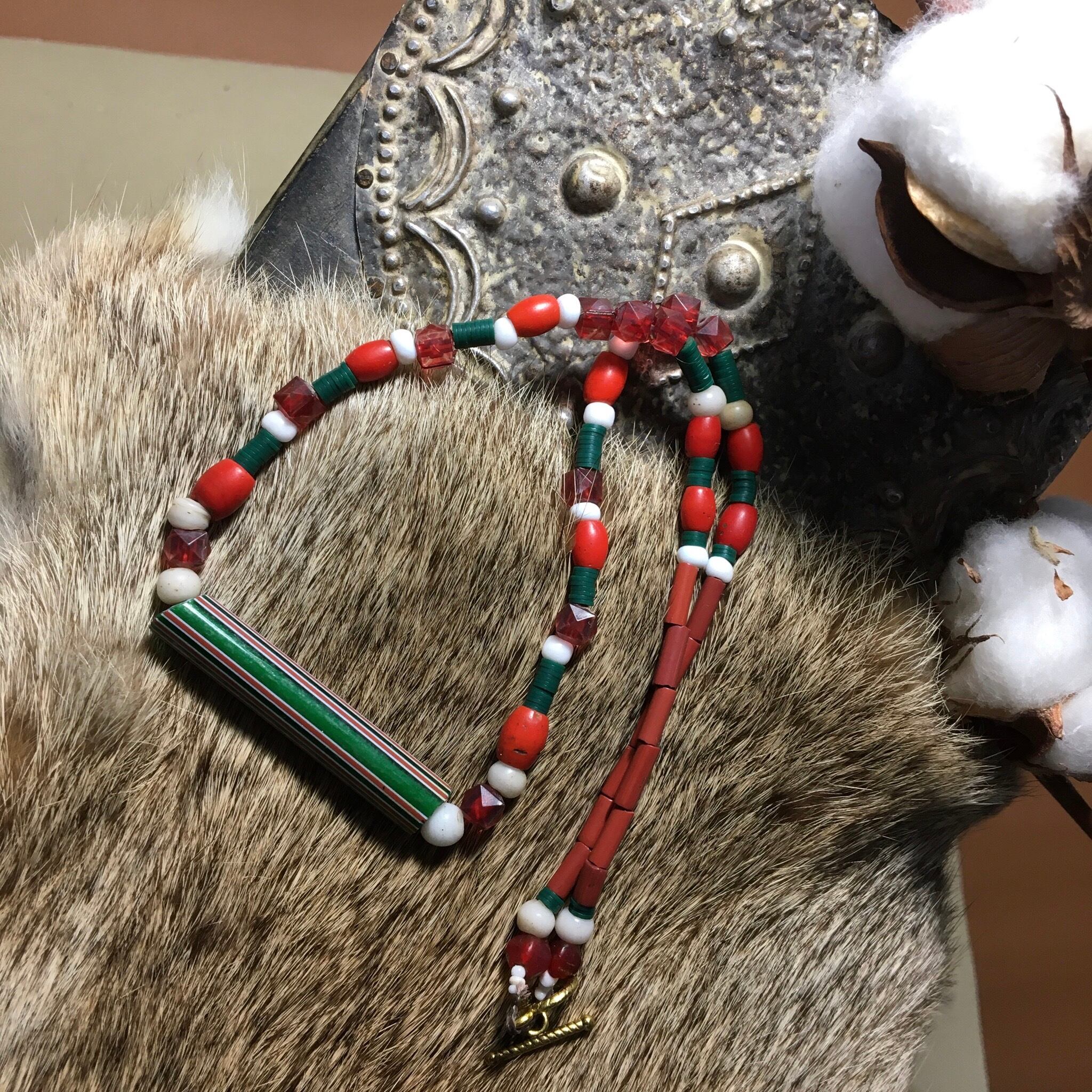 1800〜1900年代ベネチア産ロングカンネビーズをTOPに紅白カラーで揃えたタマン族ビーズ、アンティークアフリカンレコード盤グリーンビーズ、アンティークベネチア産レンガカラーのシリンダー型ビーズを使用したクリスマスカラーネックレス作品。