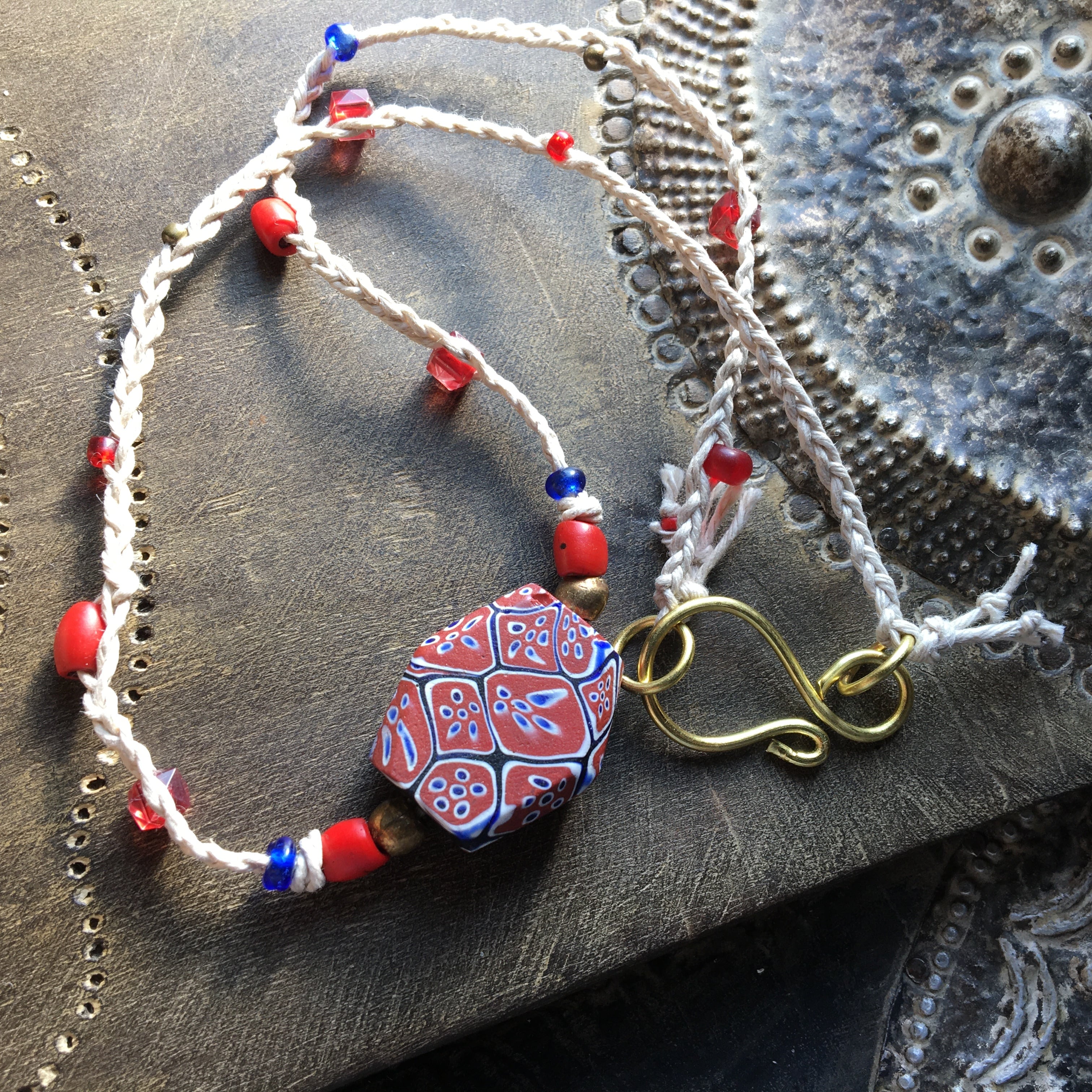 アンティークミルフィオリ六角形レアなベガ玉にタル族レッドビーズを麻紐で編み込み赤と青で統一したネックレス作品。