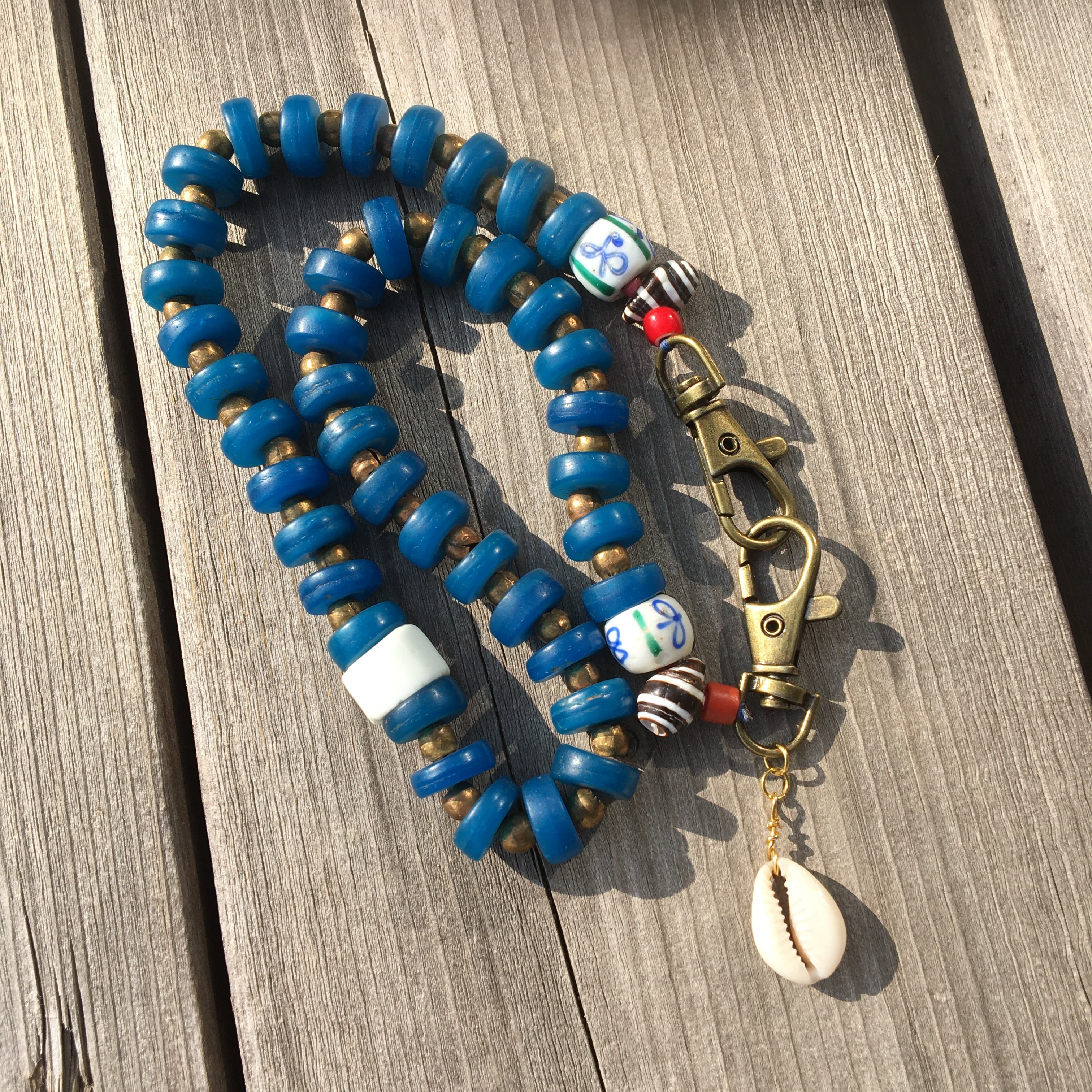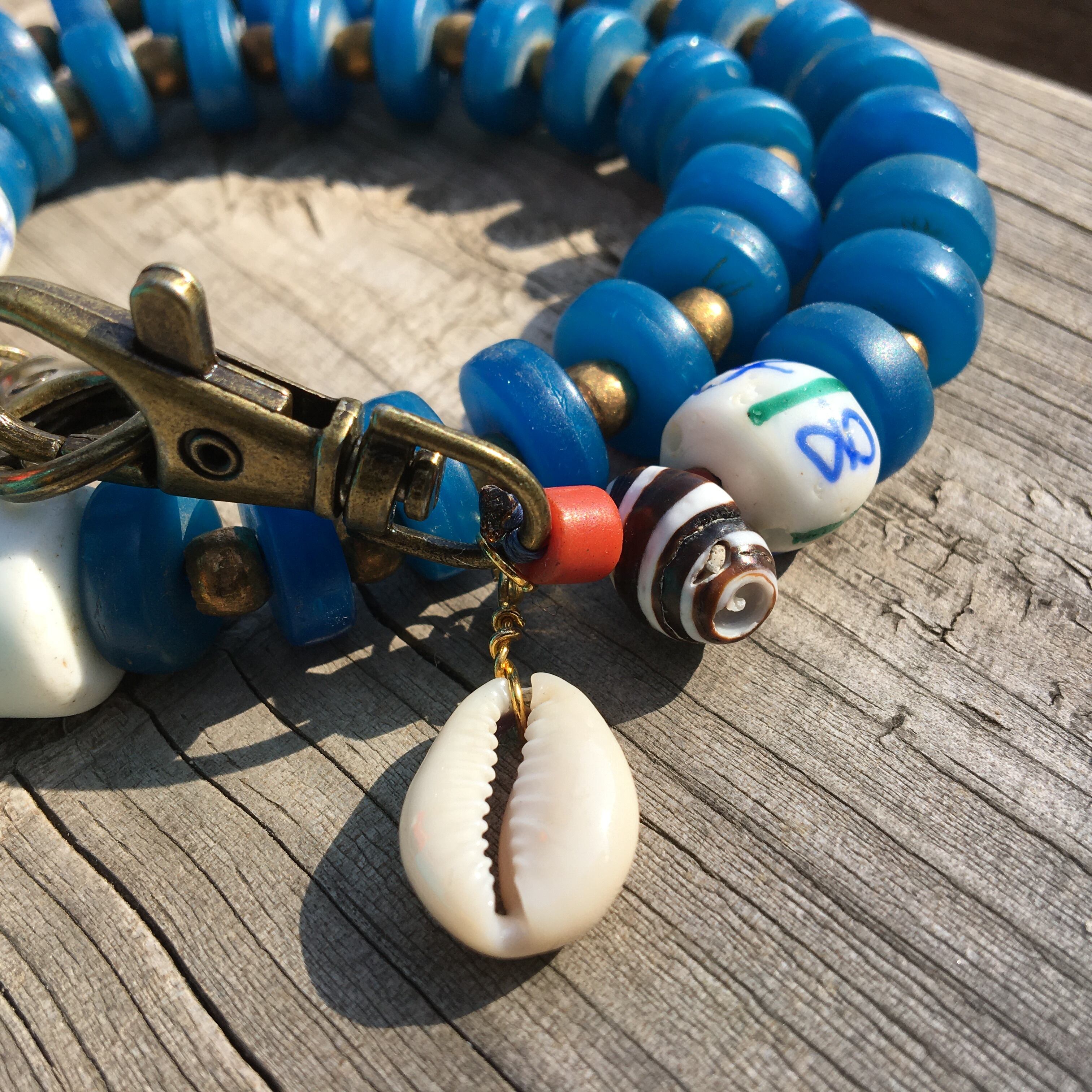 エンドにはアンティークベネチアファンシービーズ、アンティークのホワイトハーツ、貝殻を使用したウォレットチェーン作品。
