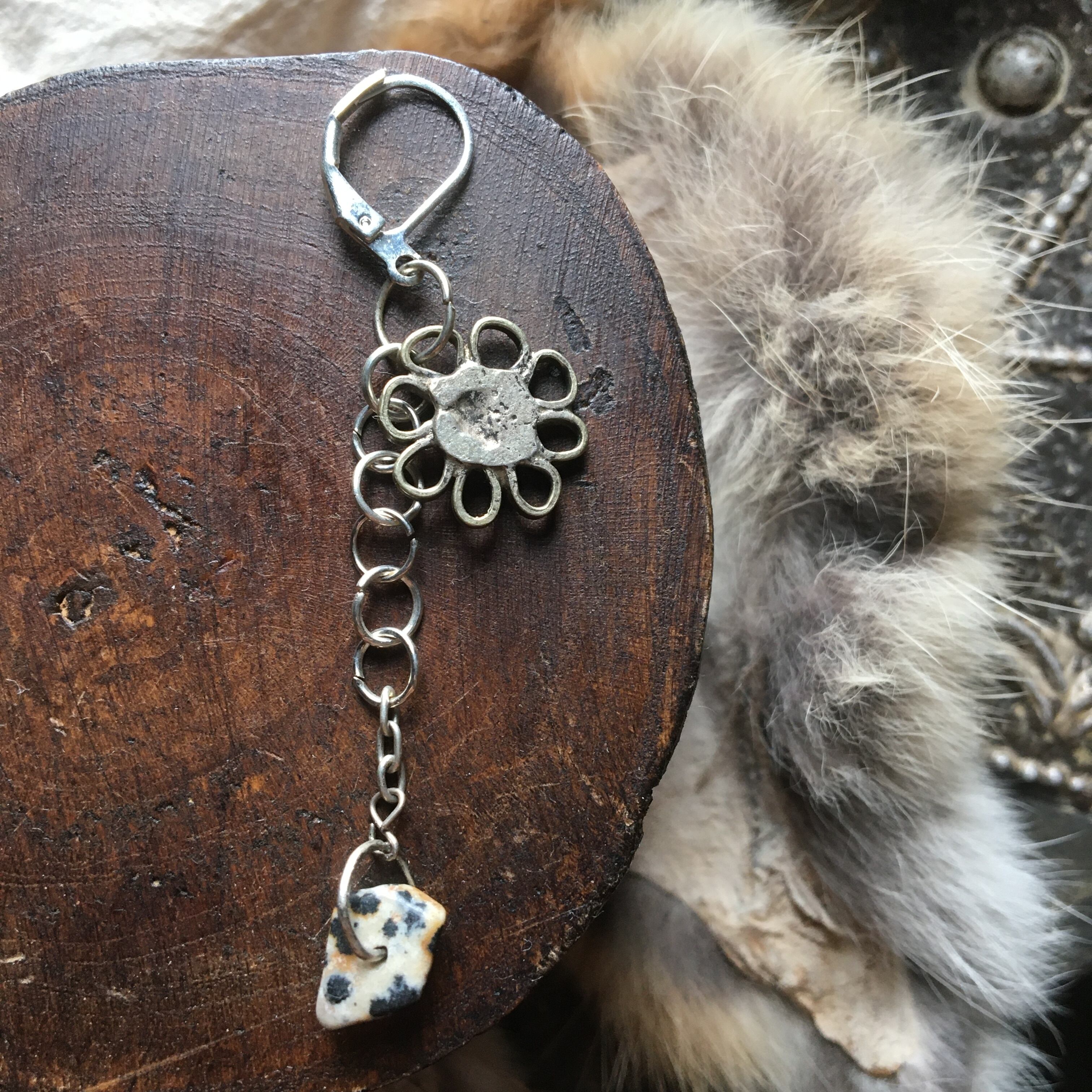 少数民族のパーツ、ダルメシアンジャスパーをぶら下げたピアス作品。