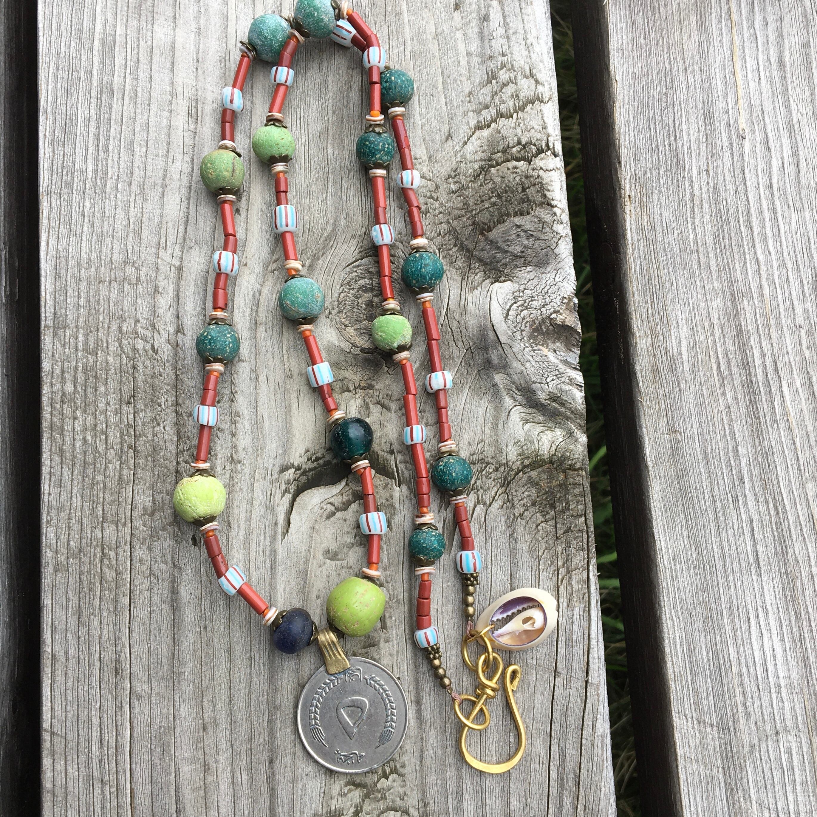 1800〜1900年代ベネチア産アンティークビーズ、オールドアフガニスタンコイン、貝殻を使用したトライバルネックレス作品。