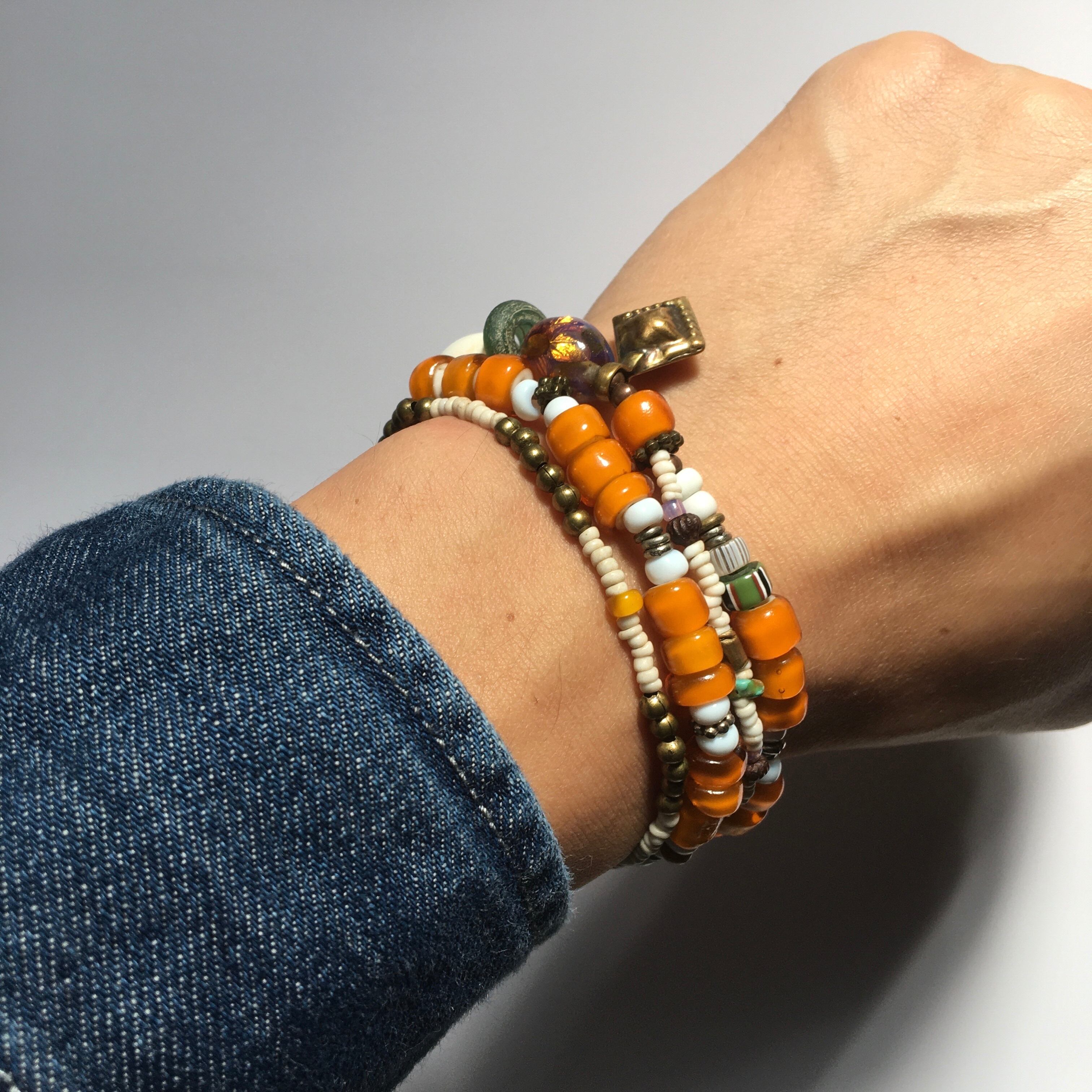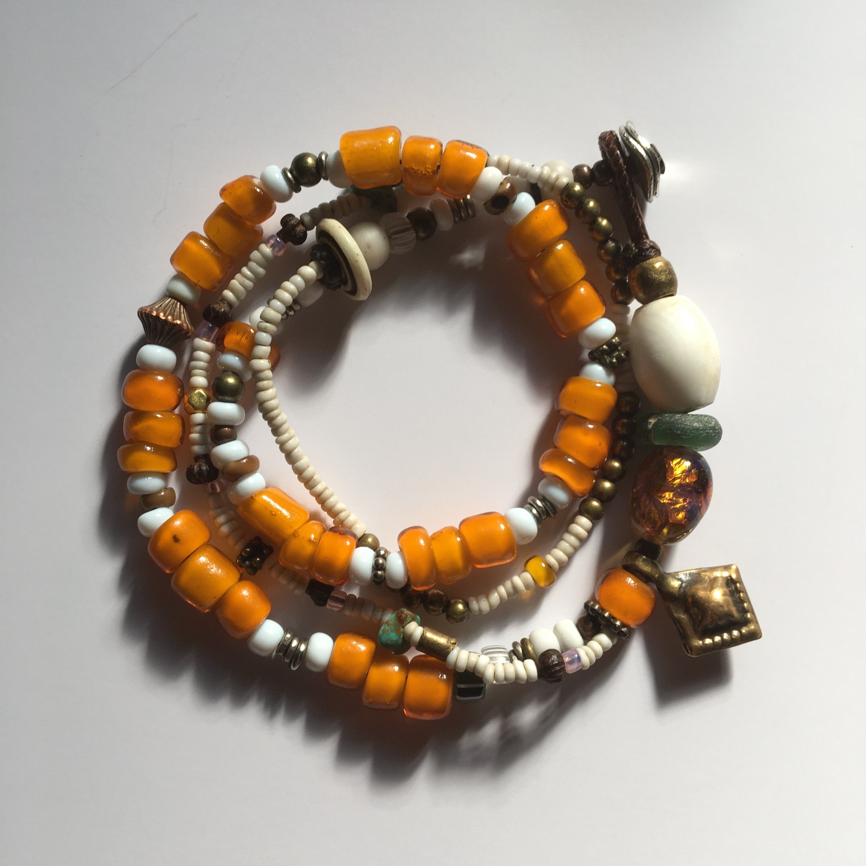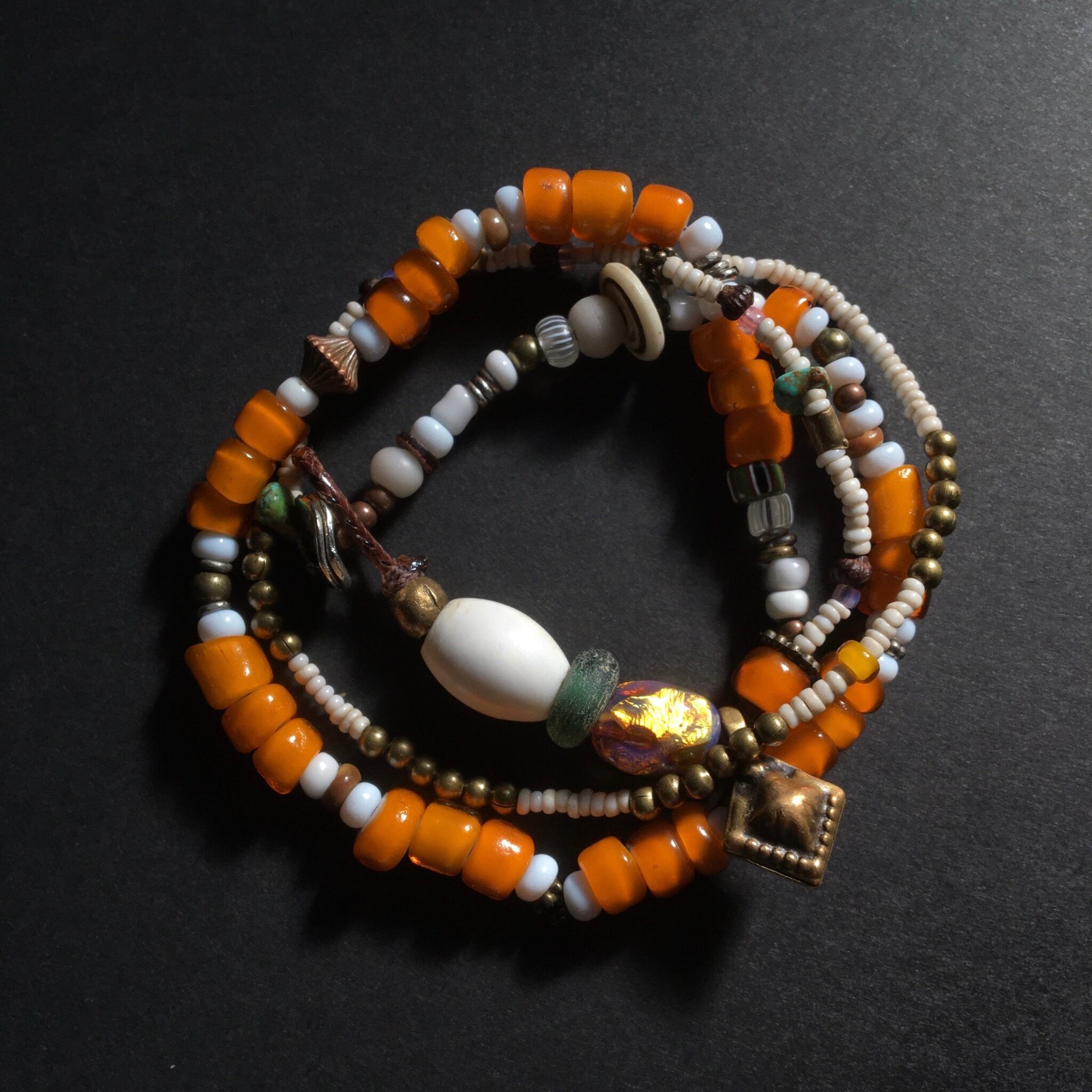 1800〜1900年代ベネチア産アンティークホワイトハーツに幻想的で夕焼けの様な美しさのある、アール・デコ オパールセントフォイルビーズ、アンティークグリーンドーナッツビーズ、ナガ族シェルビーズ、少数民族アンティークホワイトシードビーズ、20金ゴールビーズ1個、アンティークグーズベリー、ターコイズ、ブラスチャームパーツ、留め具はメタルを使用したトライバル2連ロングブレスレット作品。