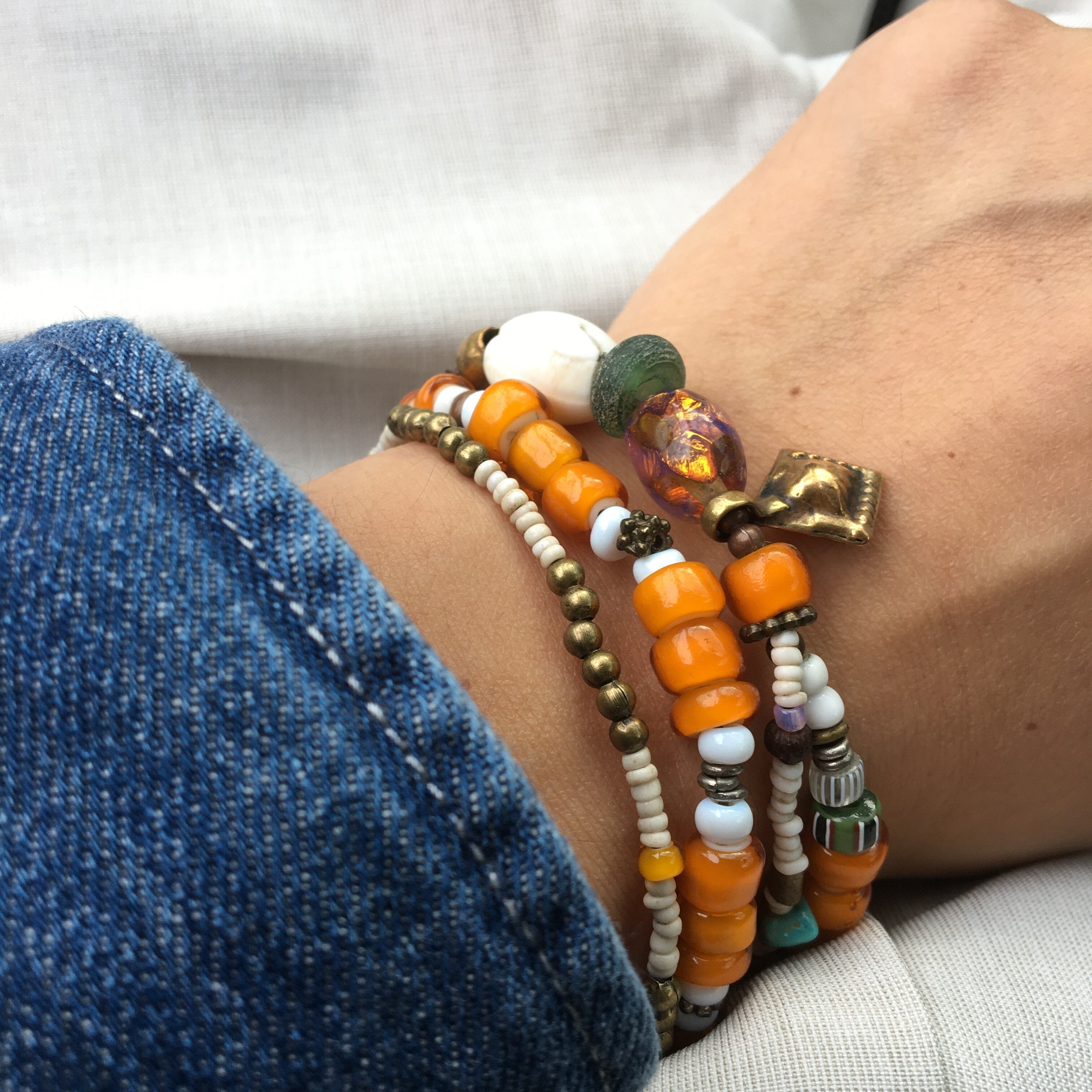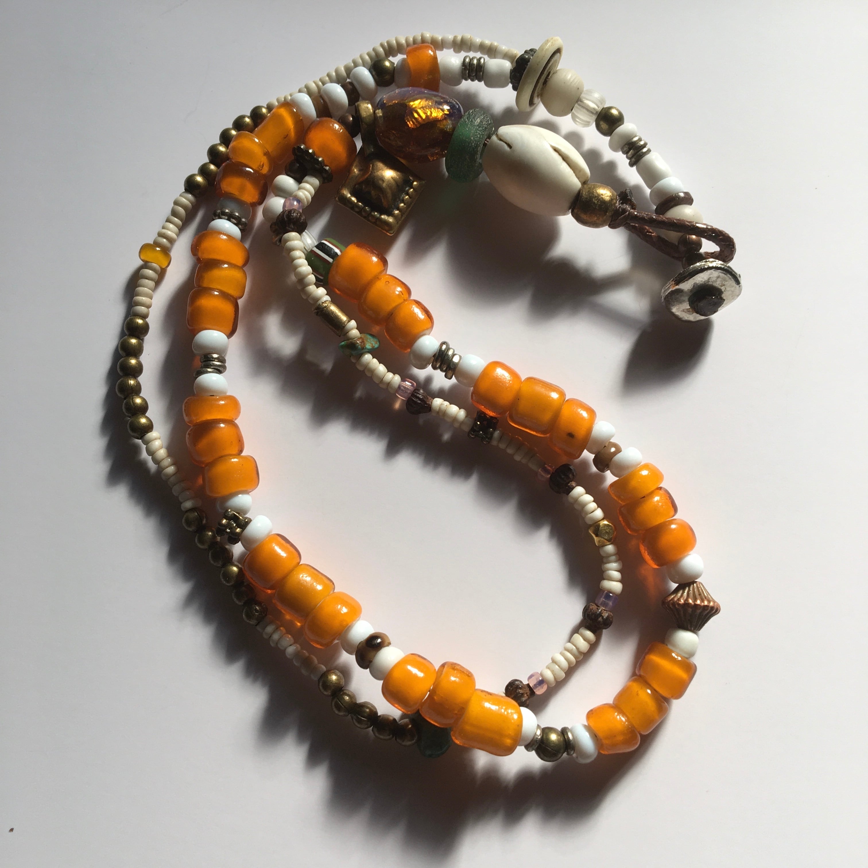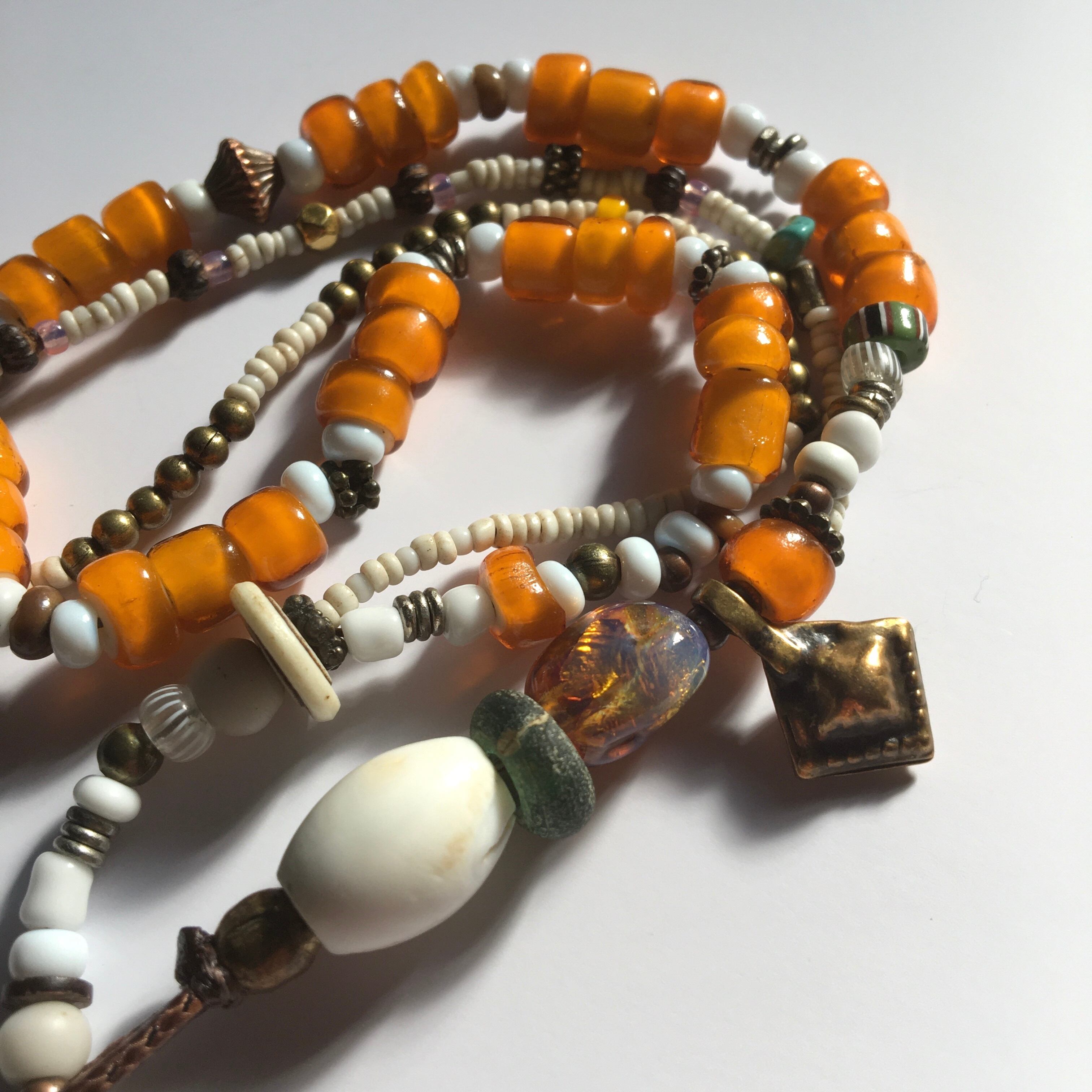 1800〜1900年代ベネチア産アンティークホワイトハーツに幻想的で夕焼けの様な美しさのある、アール・デコ オパールセントフォイルビーズ、アンティークグリーンドーナッツビーズ、ナガ族シェルビーズ、少数民族アンティークホワイトシードビーズ、20金ゴールビーズ1個、アンティークグーズベリー、ターコイズ、ブラスチャームパーツ、留め具はメタルを使用したトライバル2連ロングブレスレット作品。
