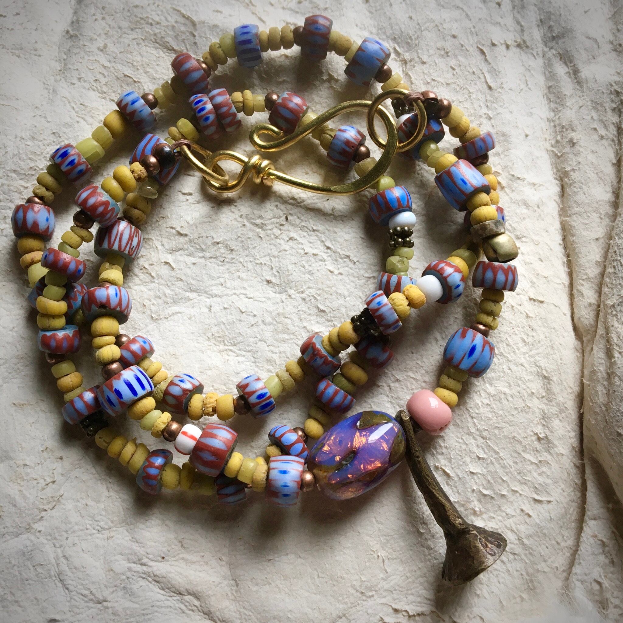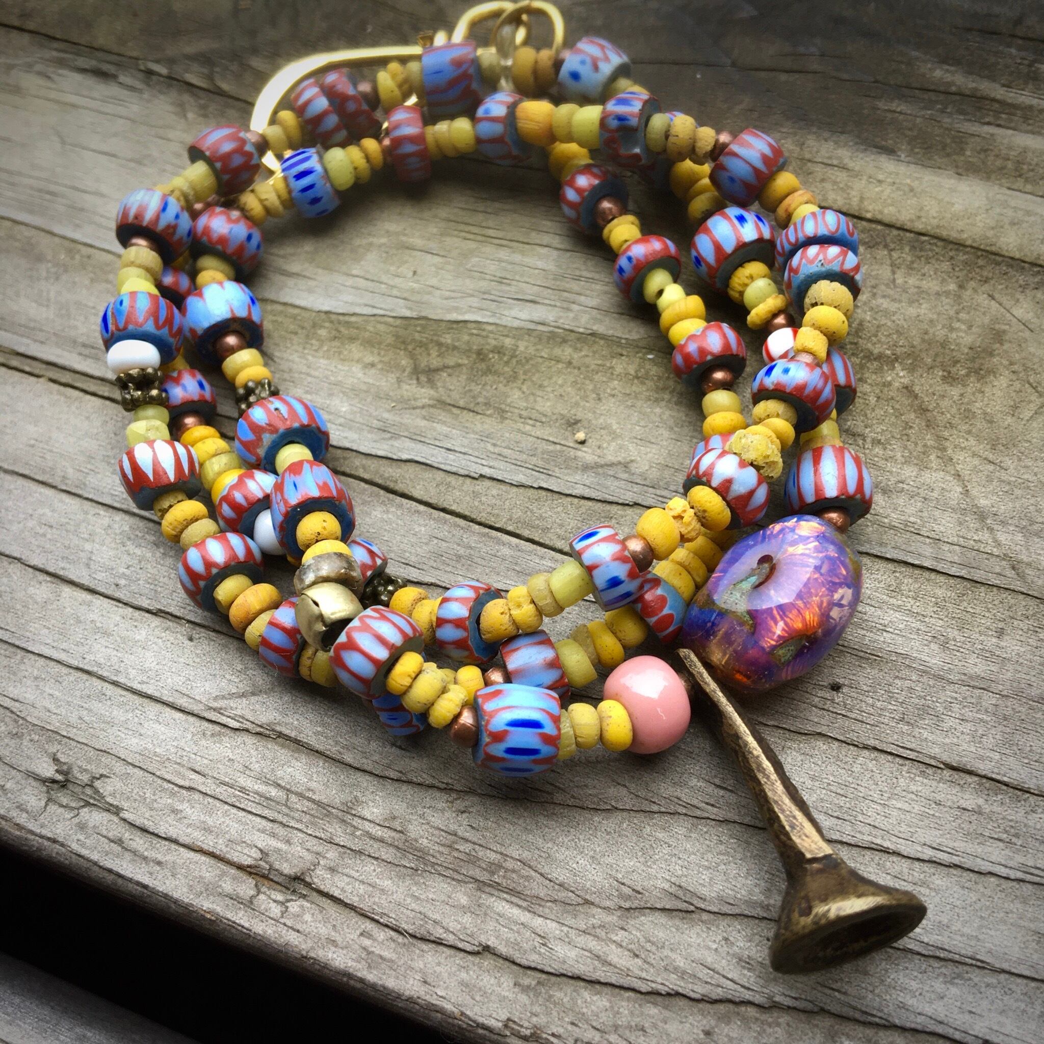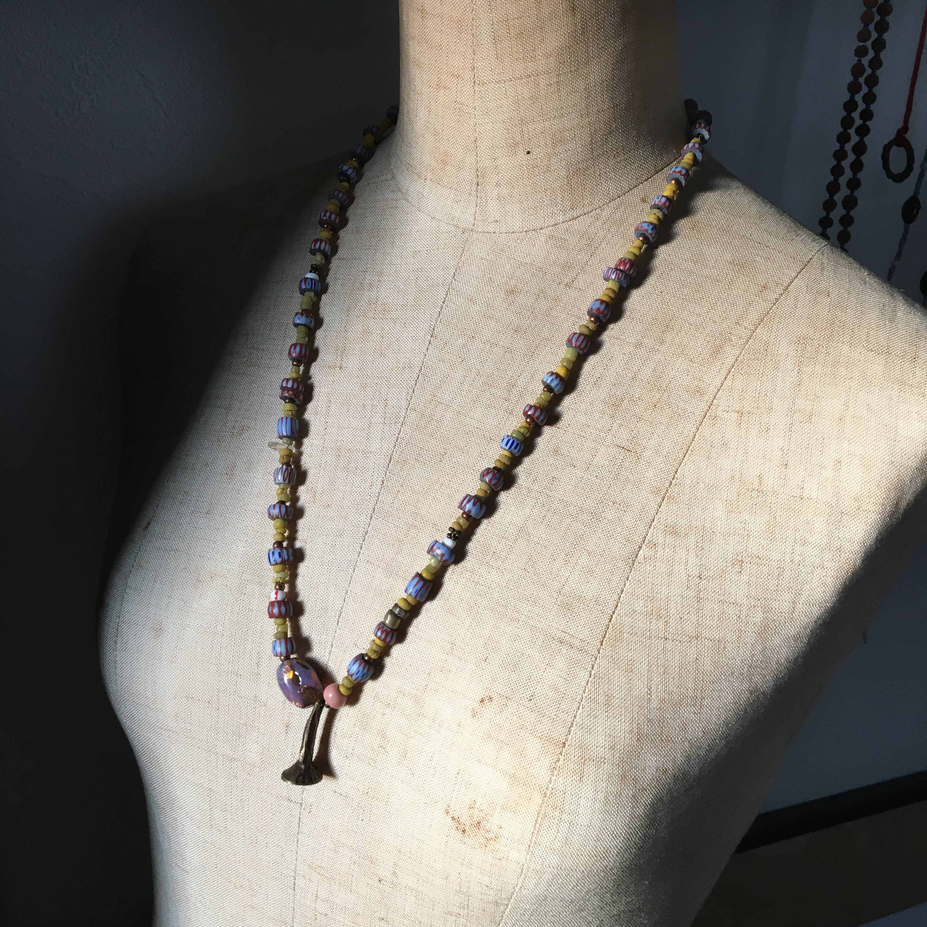 【No.454】Yellow line 魅惑のトライバルネックレス 古代インドパシフィック 幻想的 フォイルビーズ シェブロン ナガ族 ピンクマサイブラス