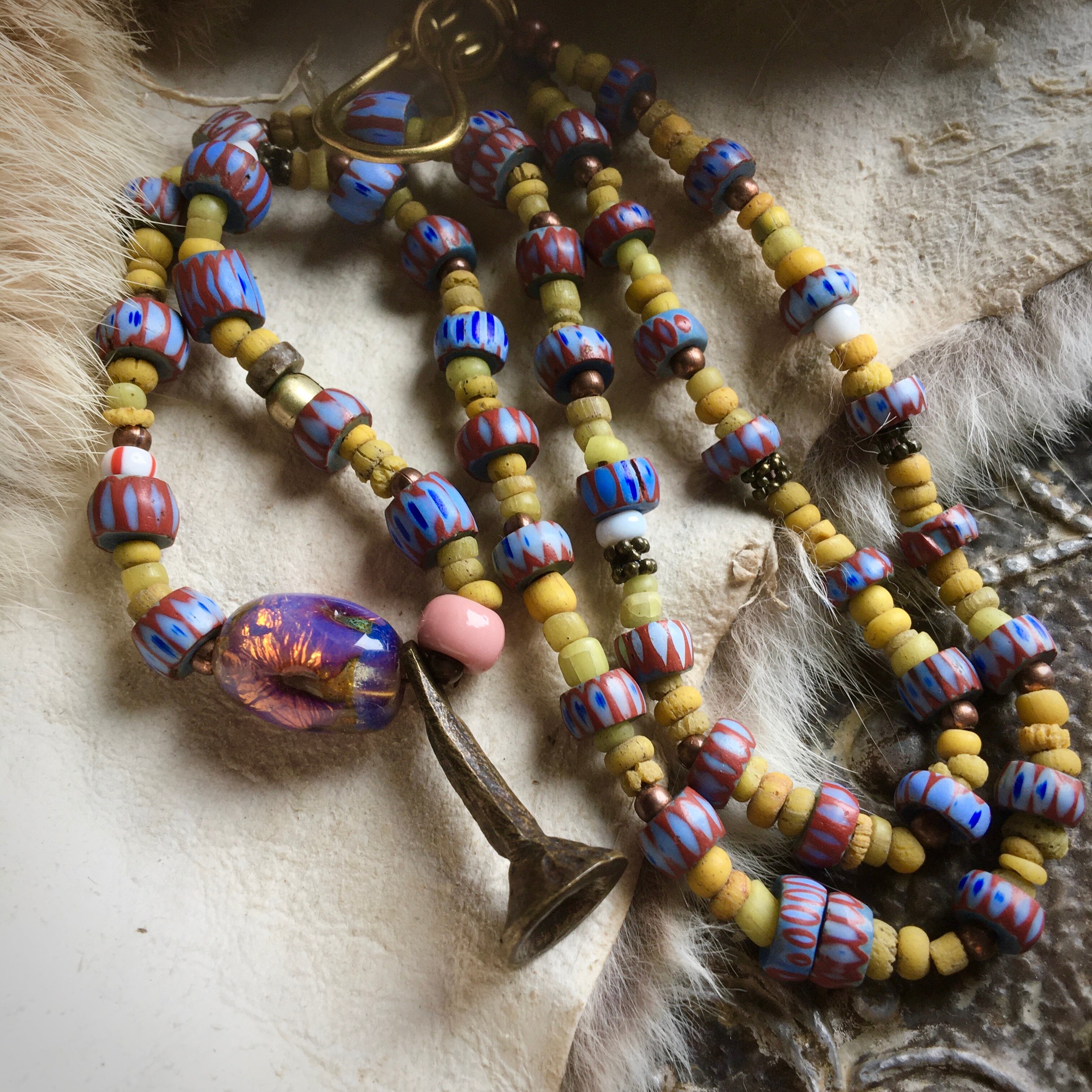 黄色と紫色の色合いがいい感じに補色したトライバルネックレス作品。