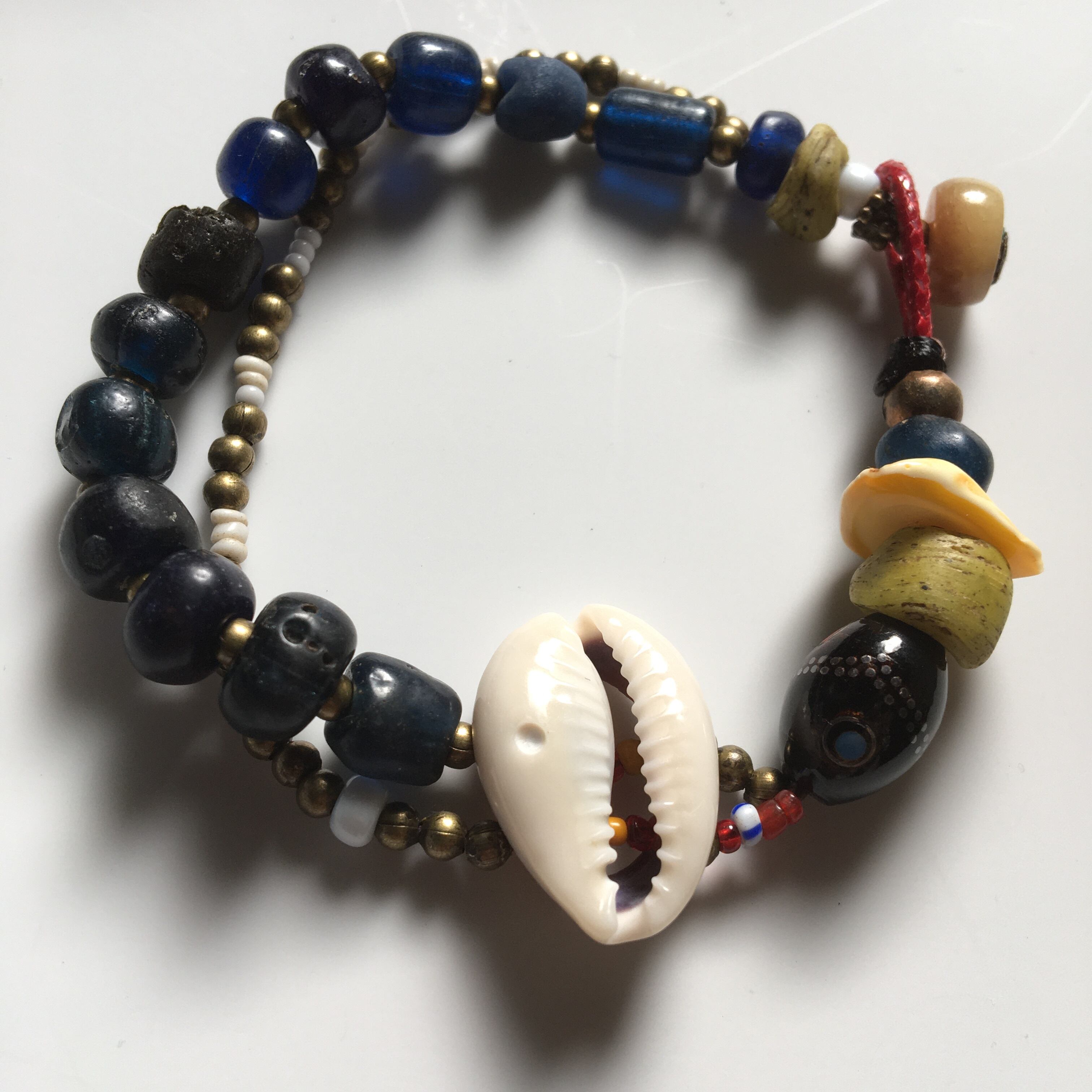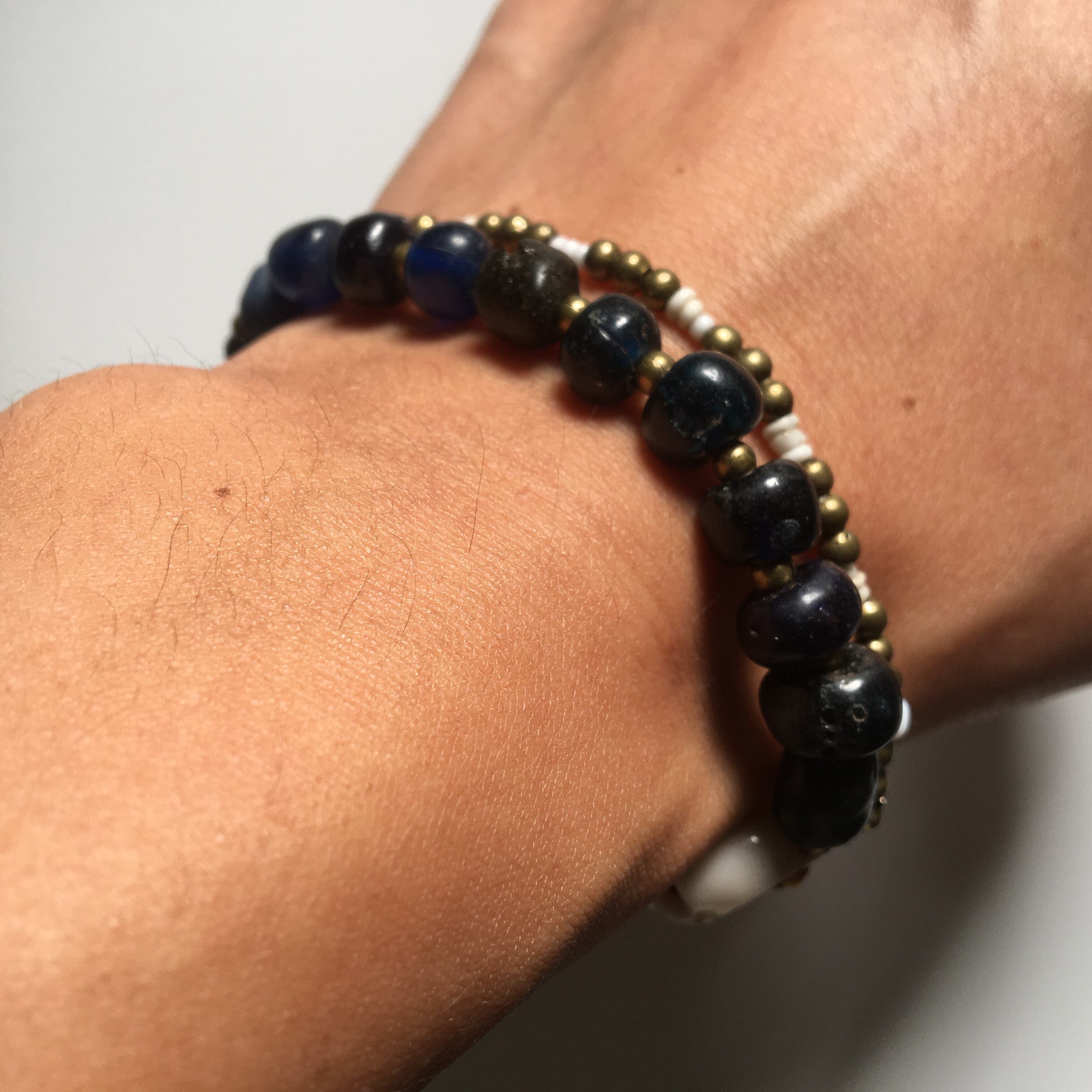 【No.459】極太 古代インドパシフィック 死海ヘブロン 黒珊瑚 貝殻 アンティークシードビーズ 2連ブレスレット