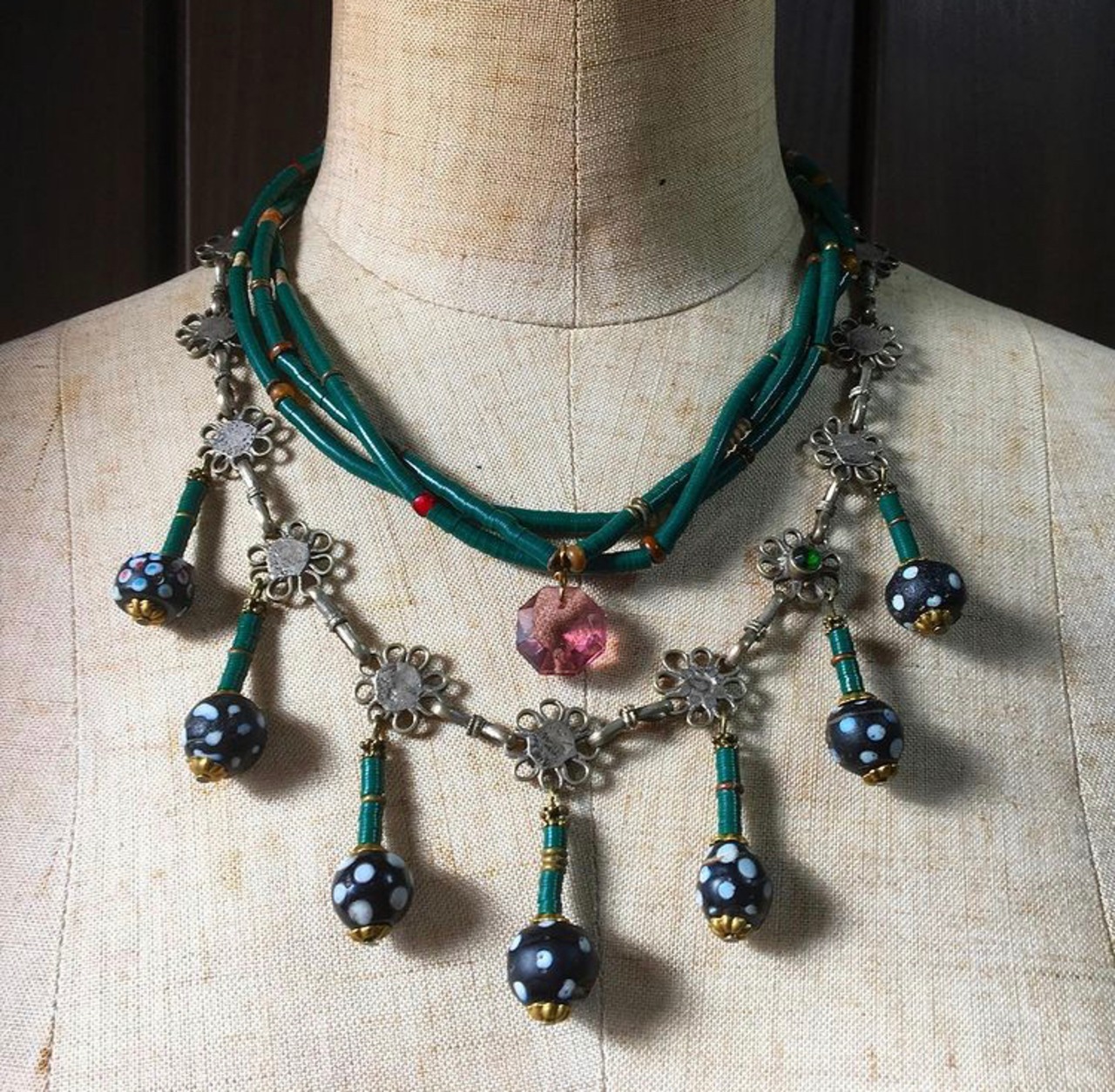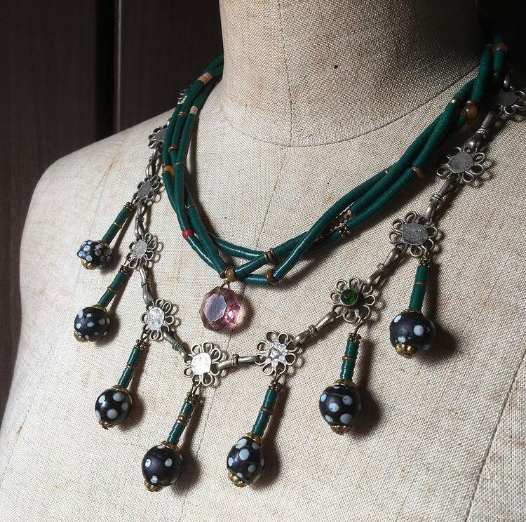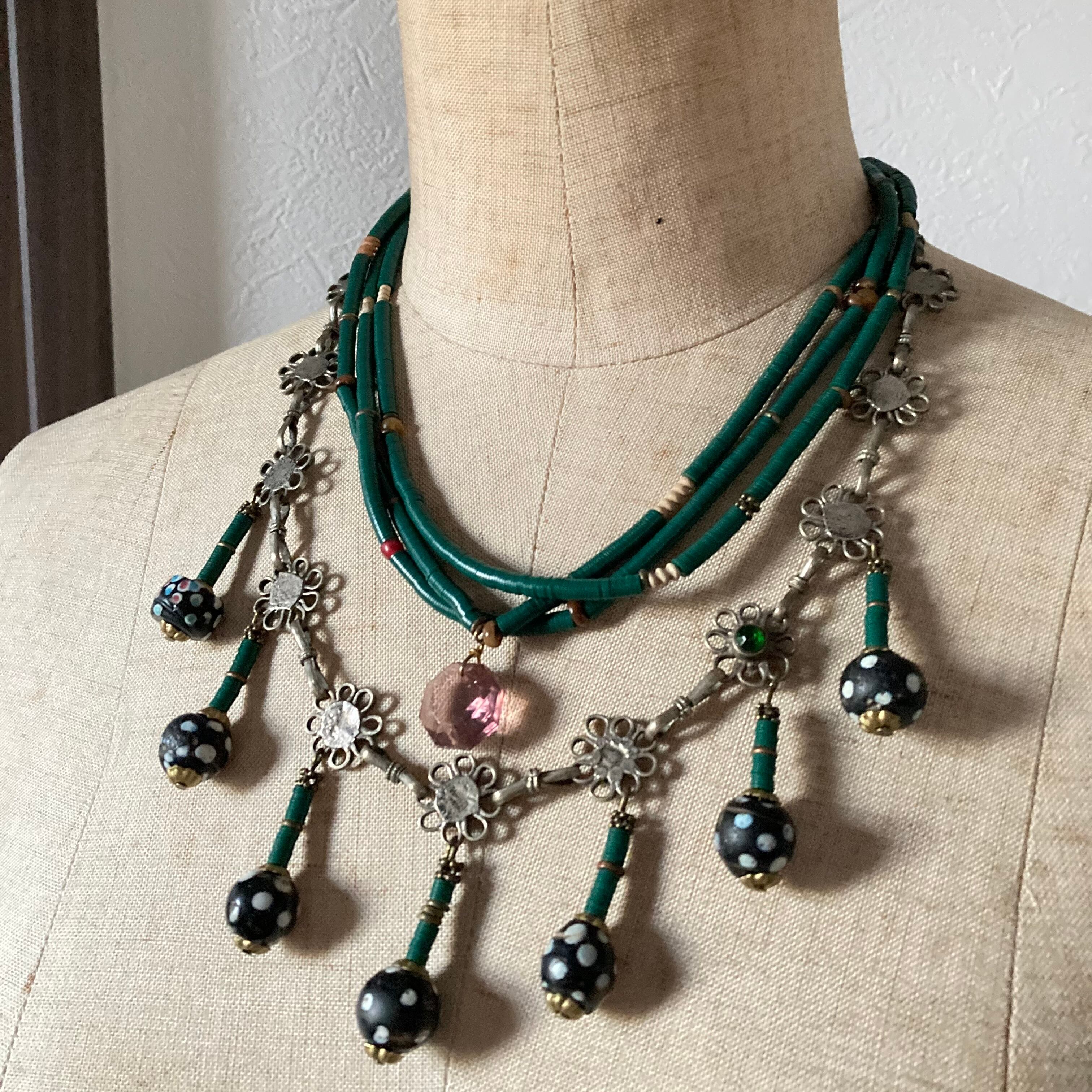 アンティークのアフリカンレコード盤グリーンビーズを蛇の様に仕様。