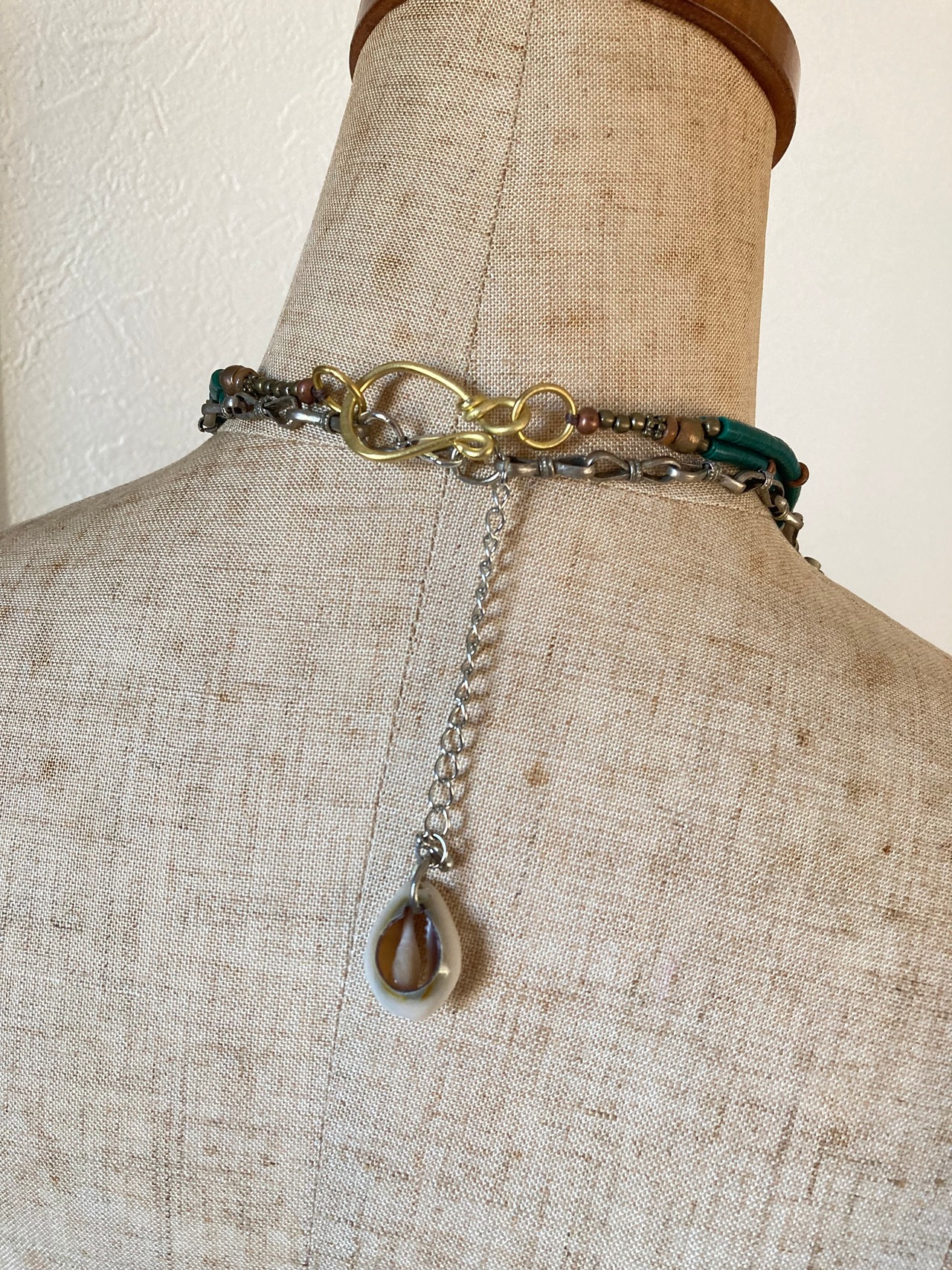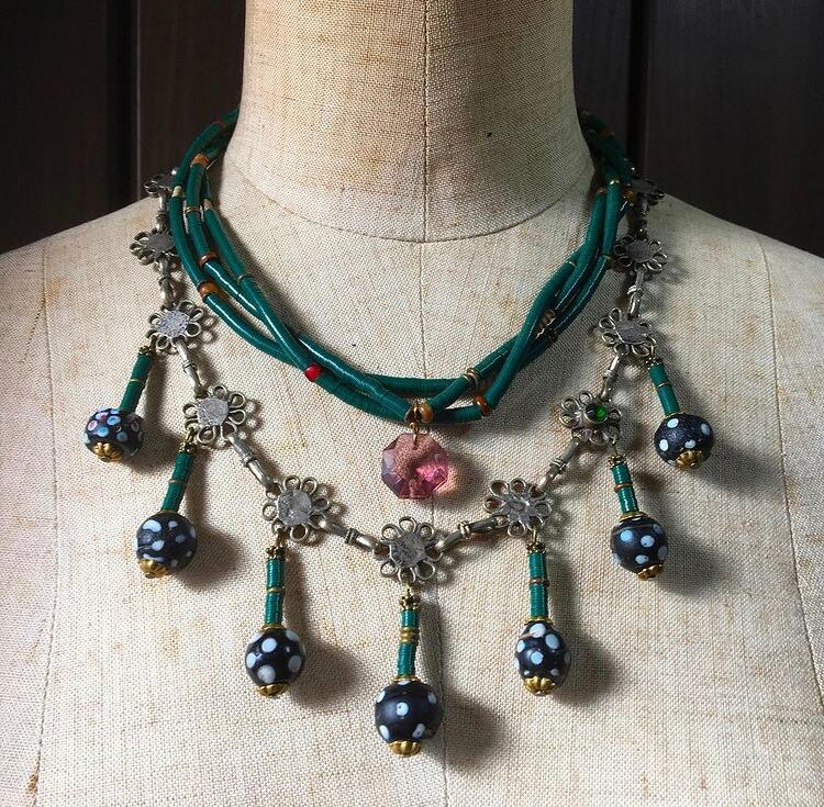 間にアンティークのアフリカンテラコッタビーズ、ポイントにアンティークホワイトハーツを使用。