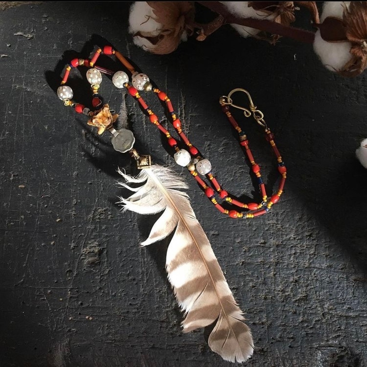 【No.490】アニミズム 本物 鷲 特大 羽 フェザー antiquebeads 蛇骨 トライバルロングネックレス