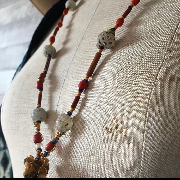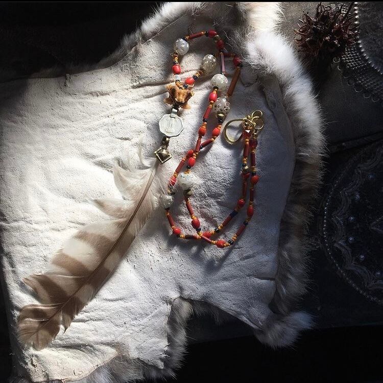 アンティークビーズ、スカンクビーズ、大オニオンスキン、ブラスパーツチャーム、アンティークネパール産特大蛇骨、オールドアフガニスタンコインを使用したお守り。