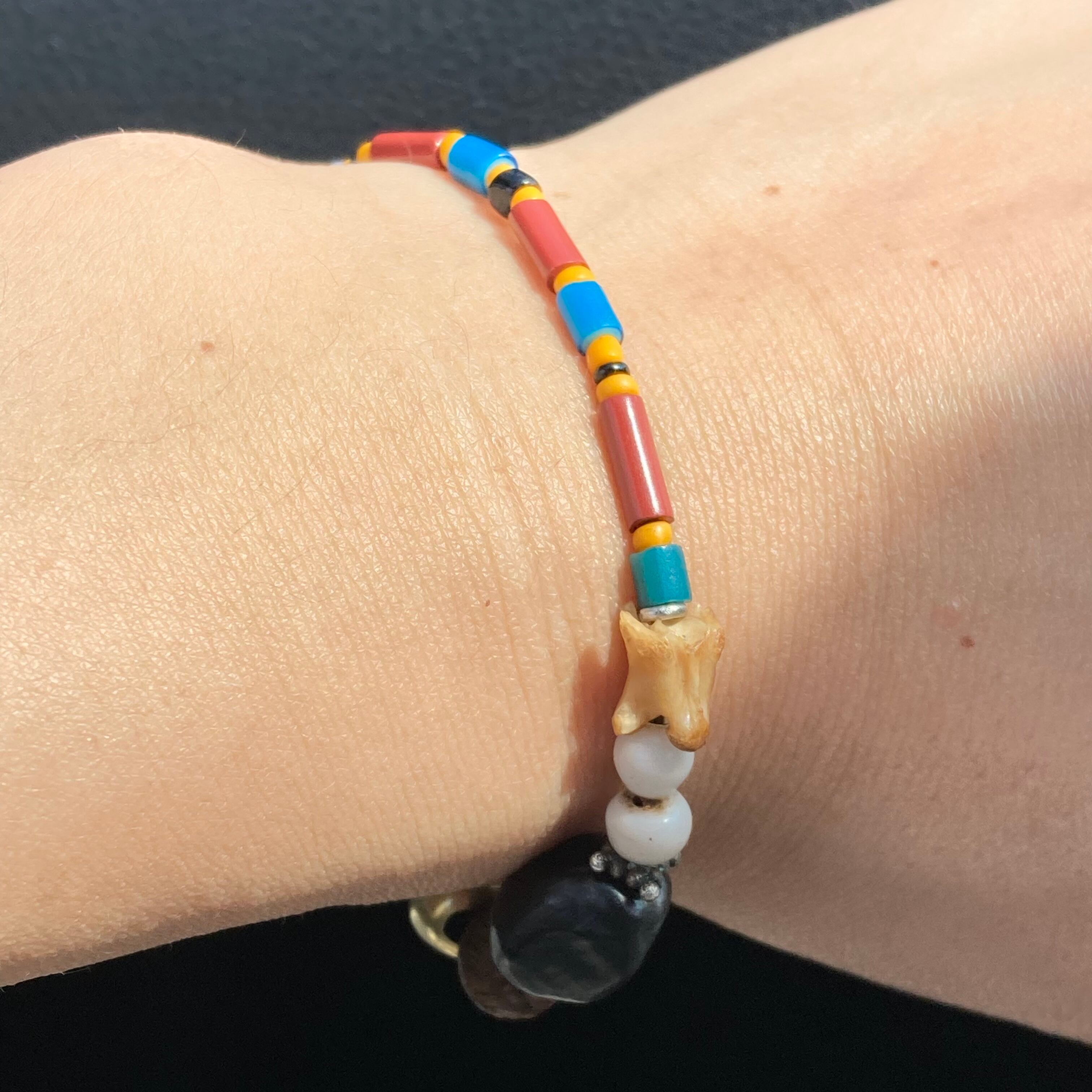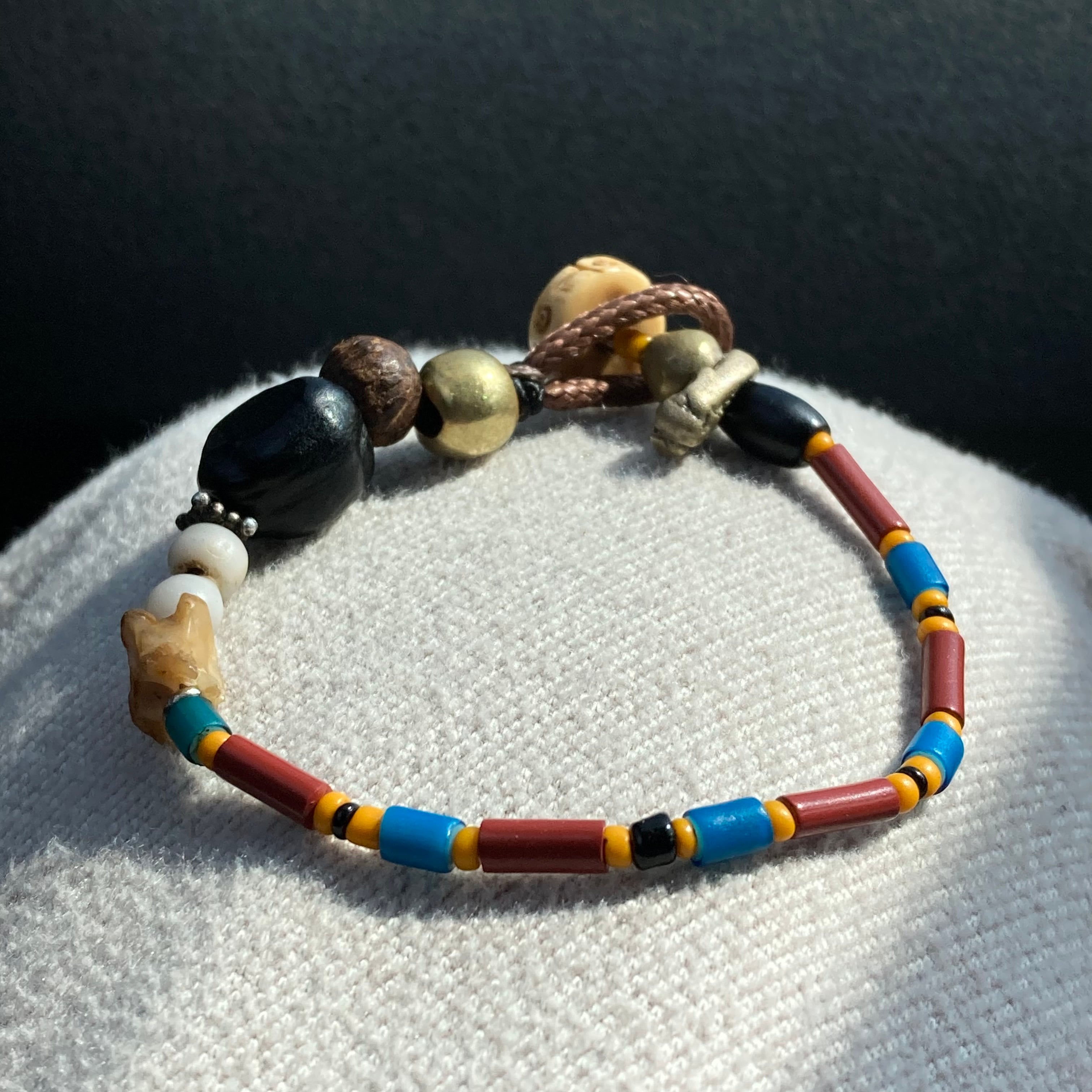 【No.502】希少アンティーク ブルーホワイトハーツ 蛇骨 少数民族オールドブラスブレスレット