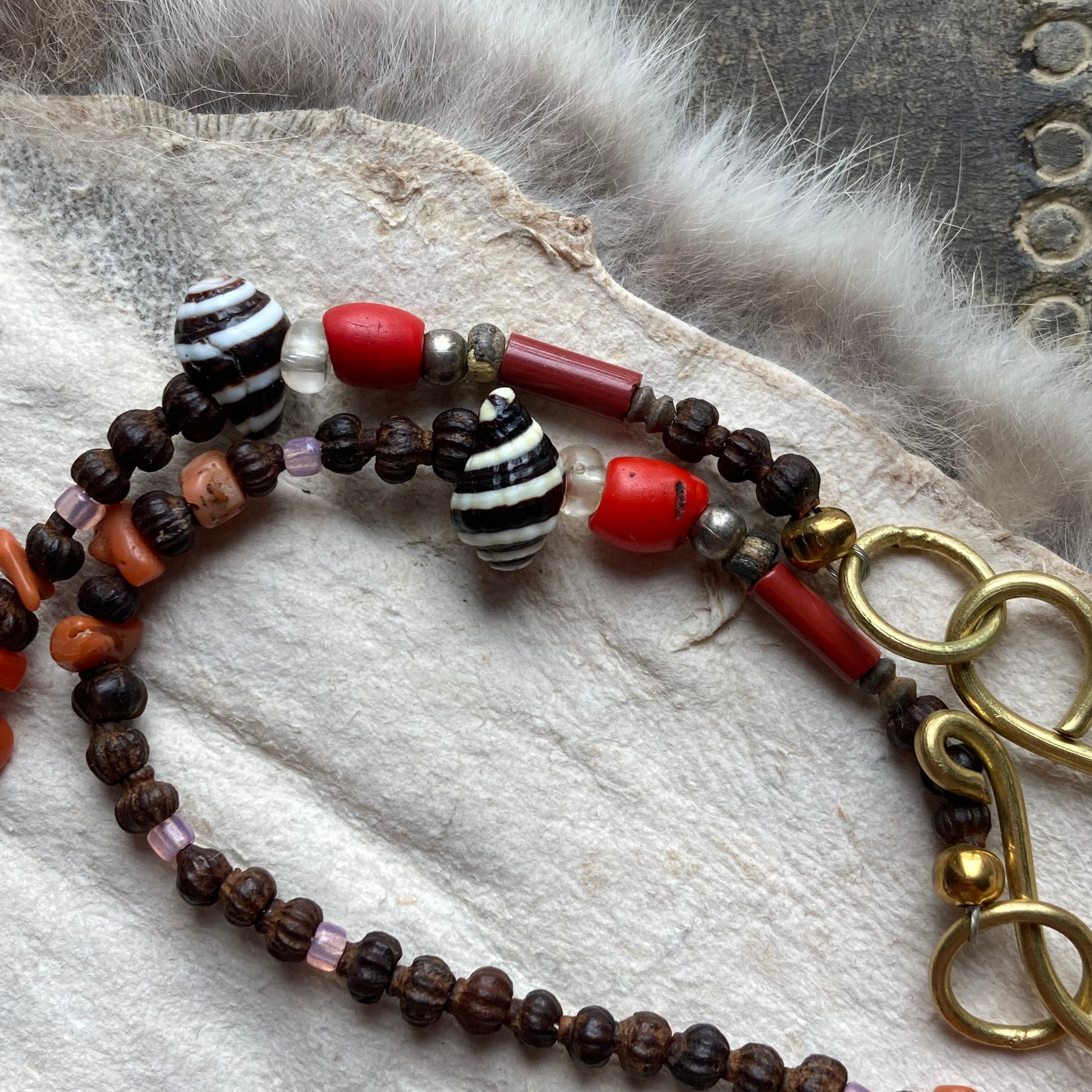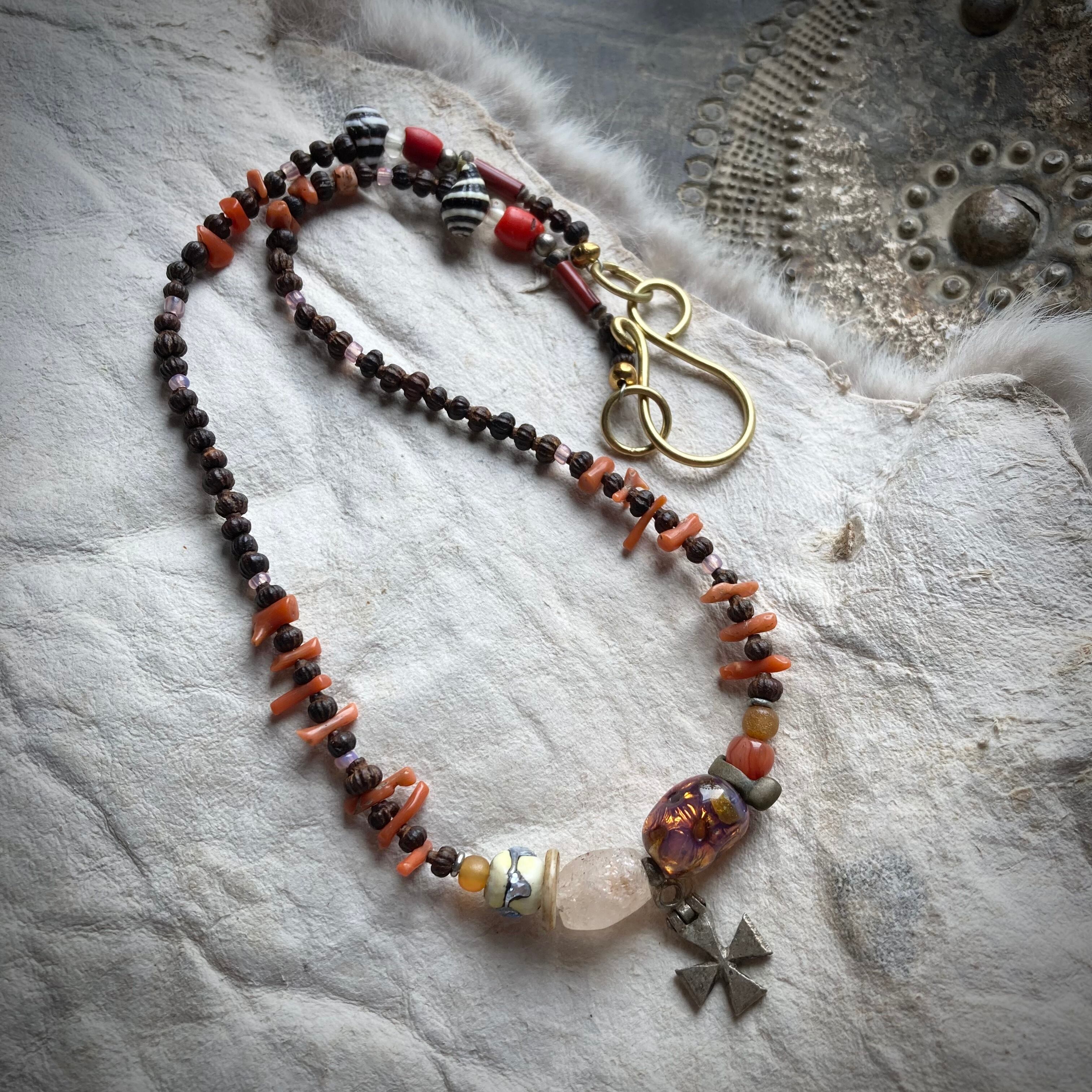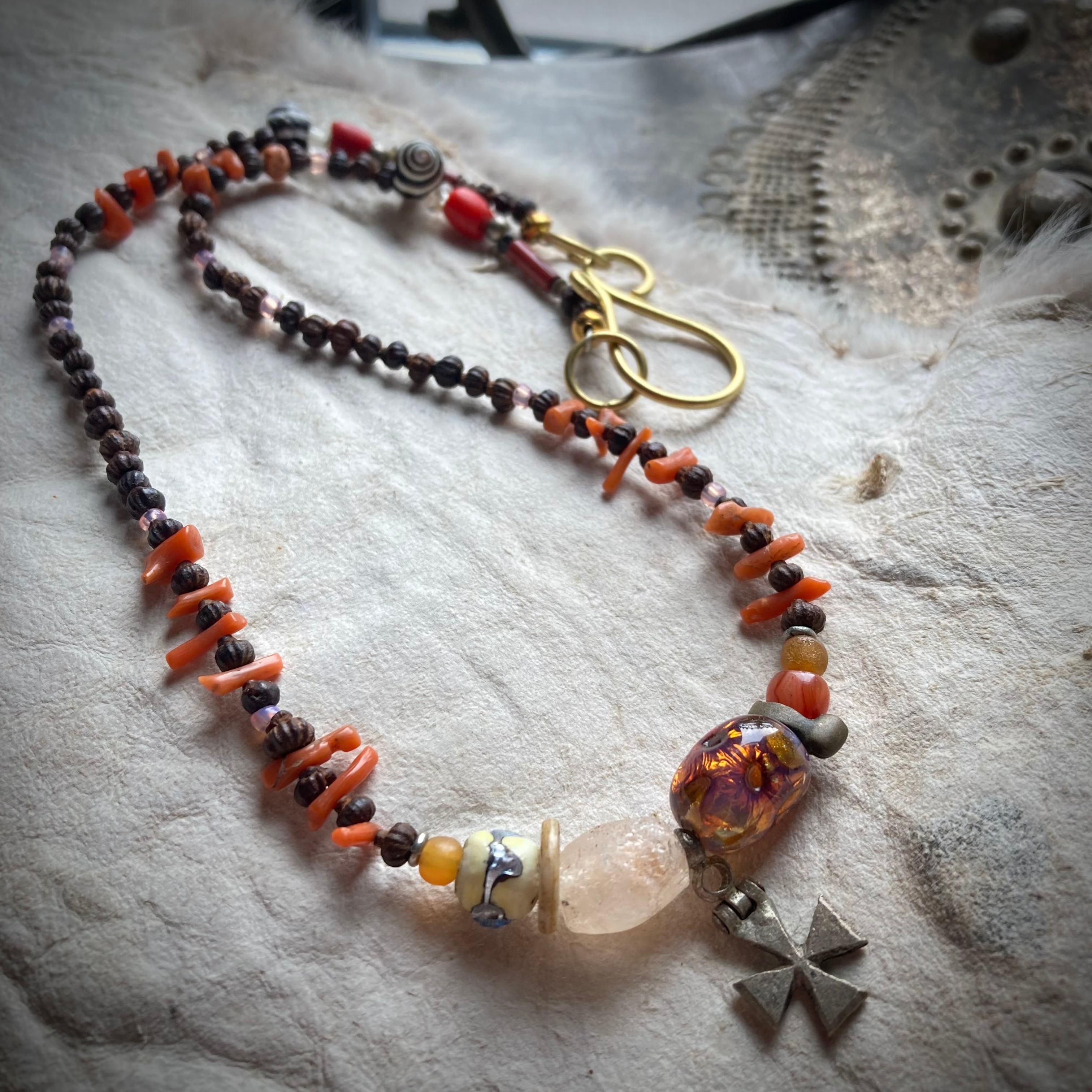 アール・デコ期に作られたとても魅力的で幻想的なフォイルビーズTOPに希少なこの頃の珊瑚コーラル、アンティークアフリカン水晶、エチオピアンクロスTOP