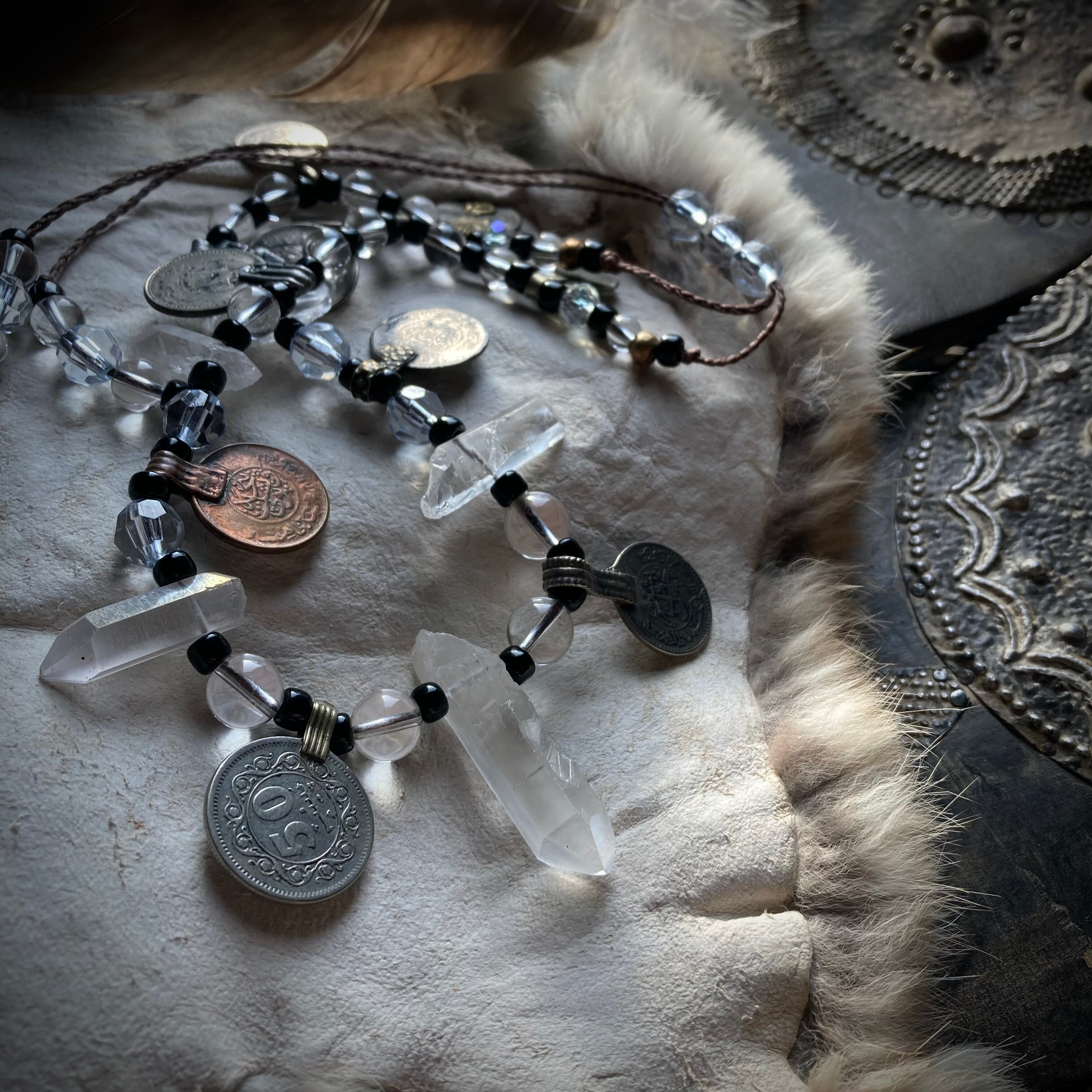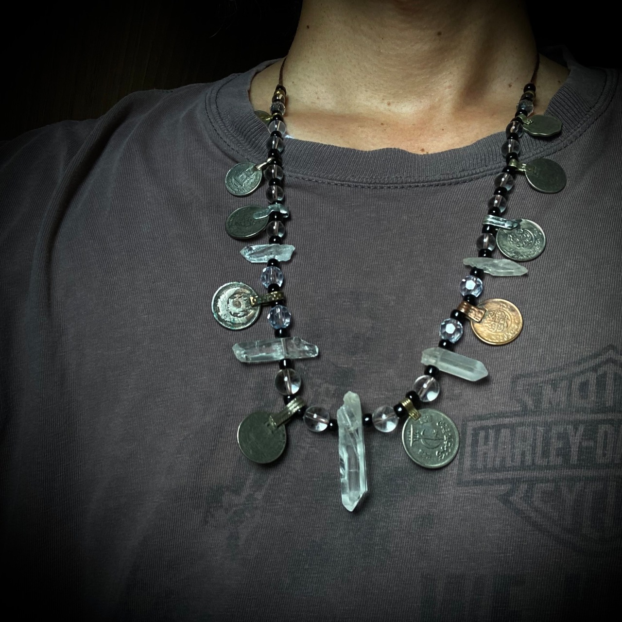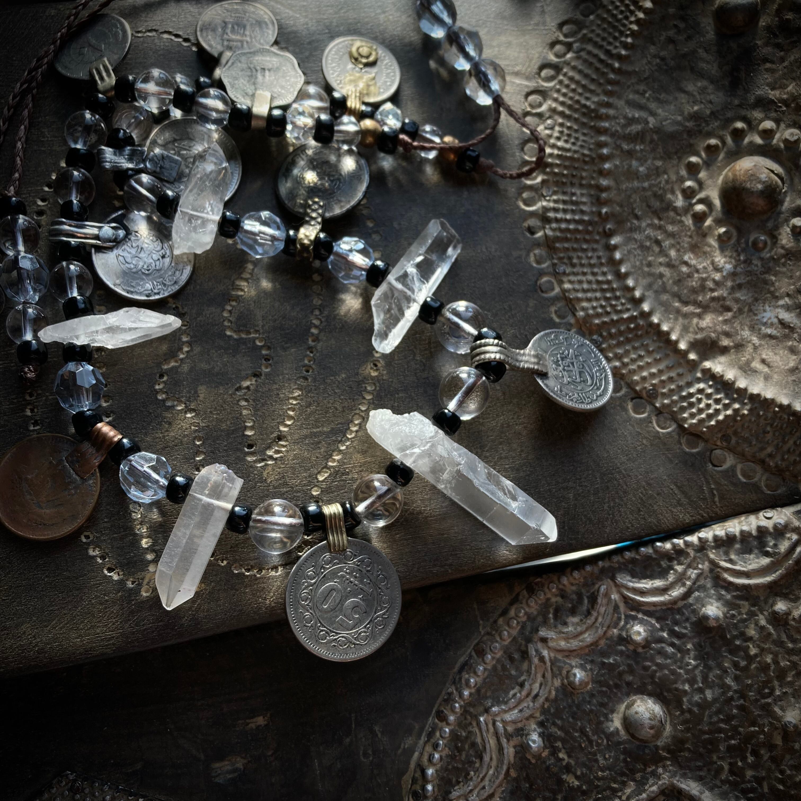 大き目の水晶TOPとオールドアフガニスタンコインをメインで製作したシックなトライバルネックレス作品。