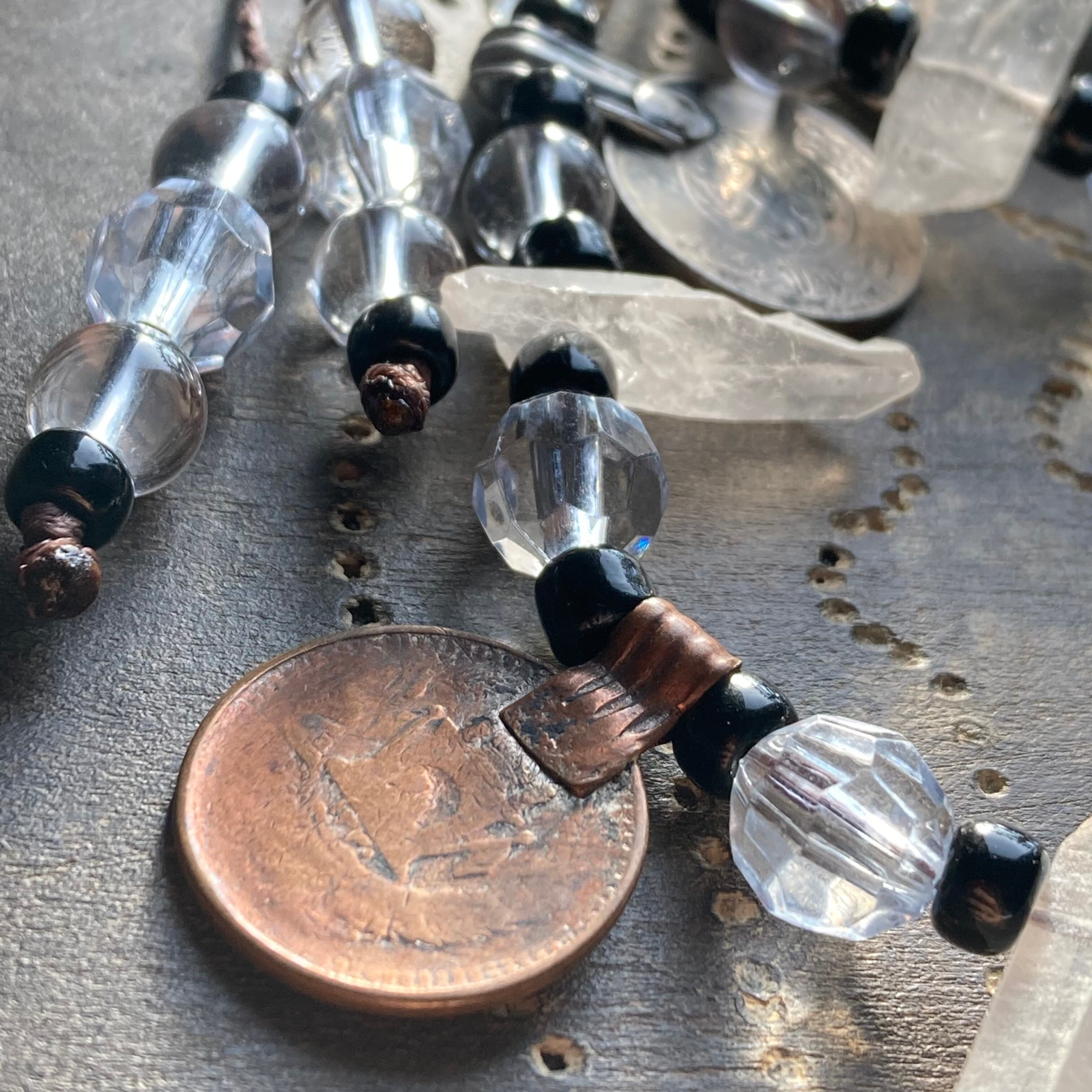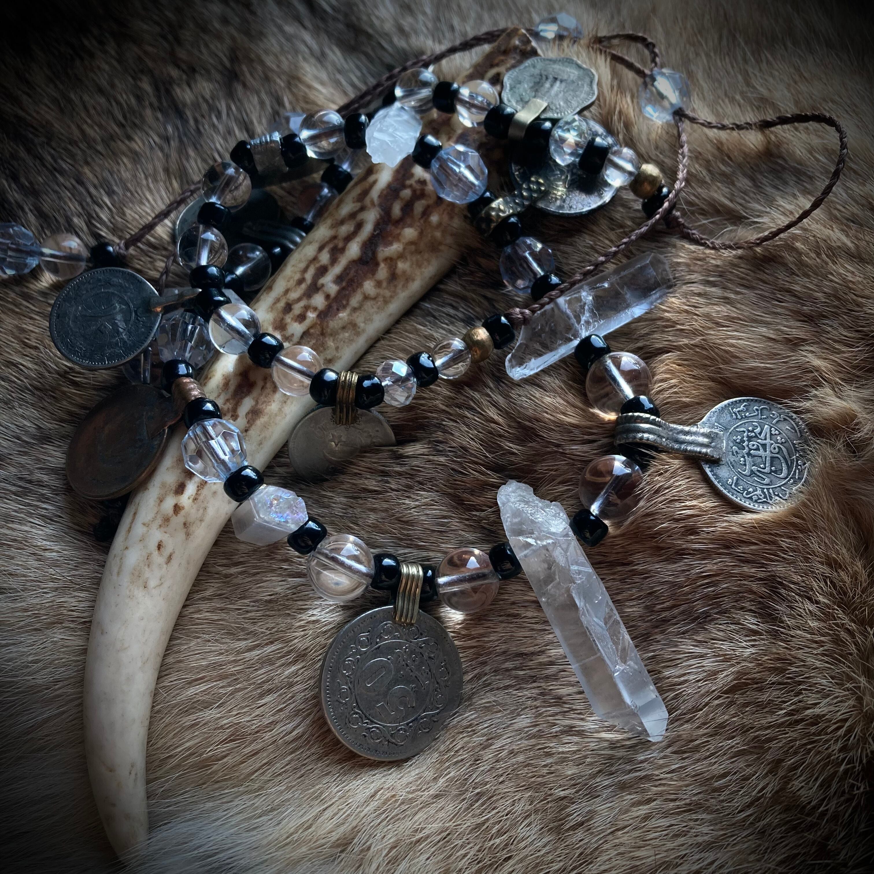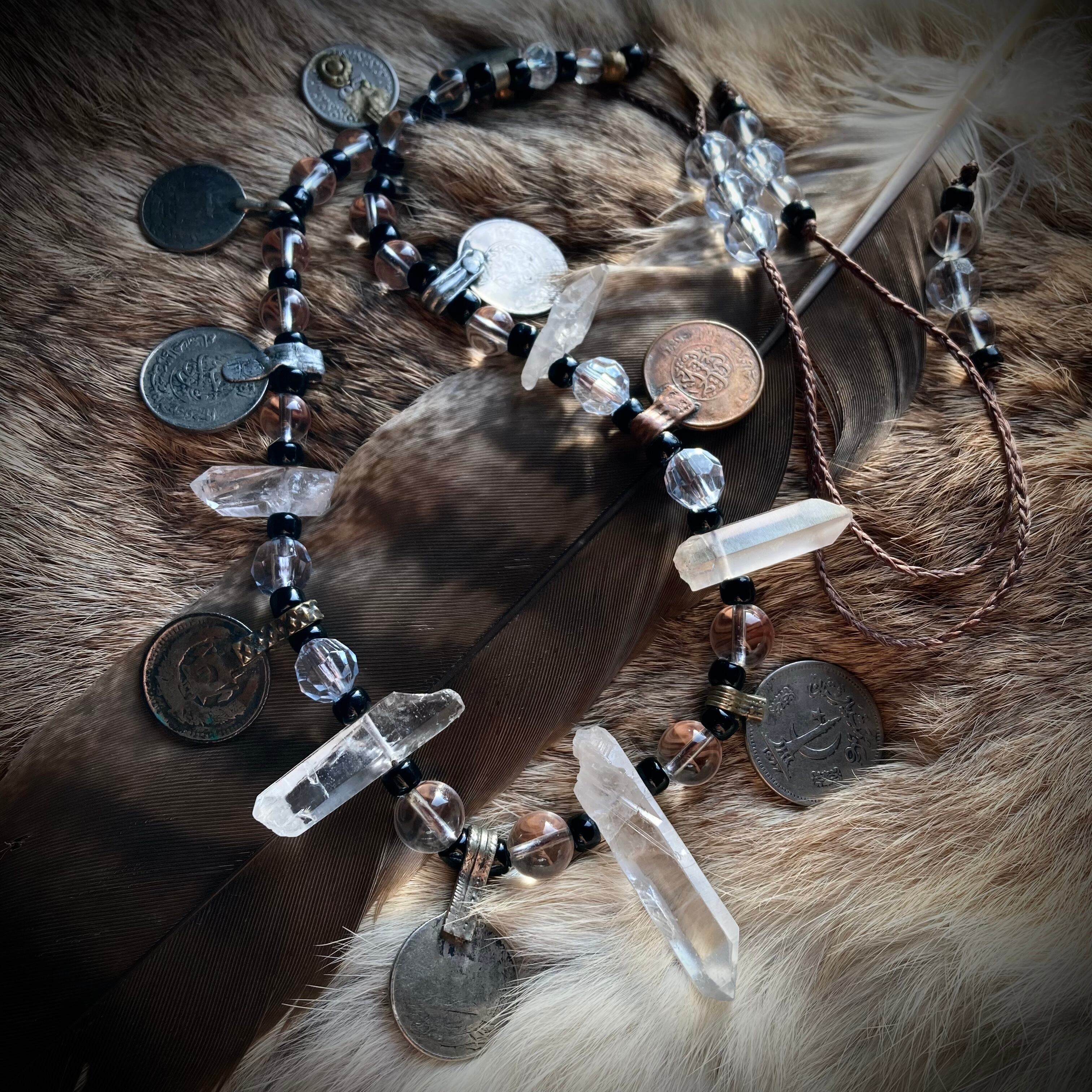 大き目の水晶TOPとオールドアフガニスタンコインをメインで製作したシックなトライバルネックレス作品。