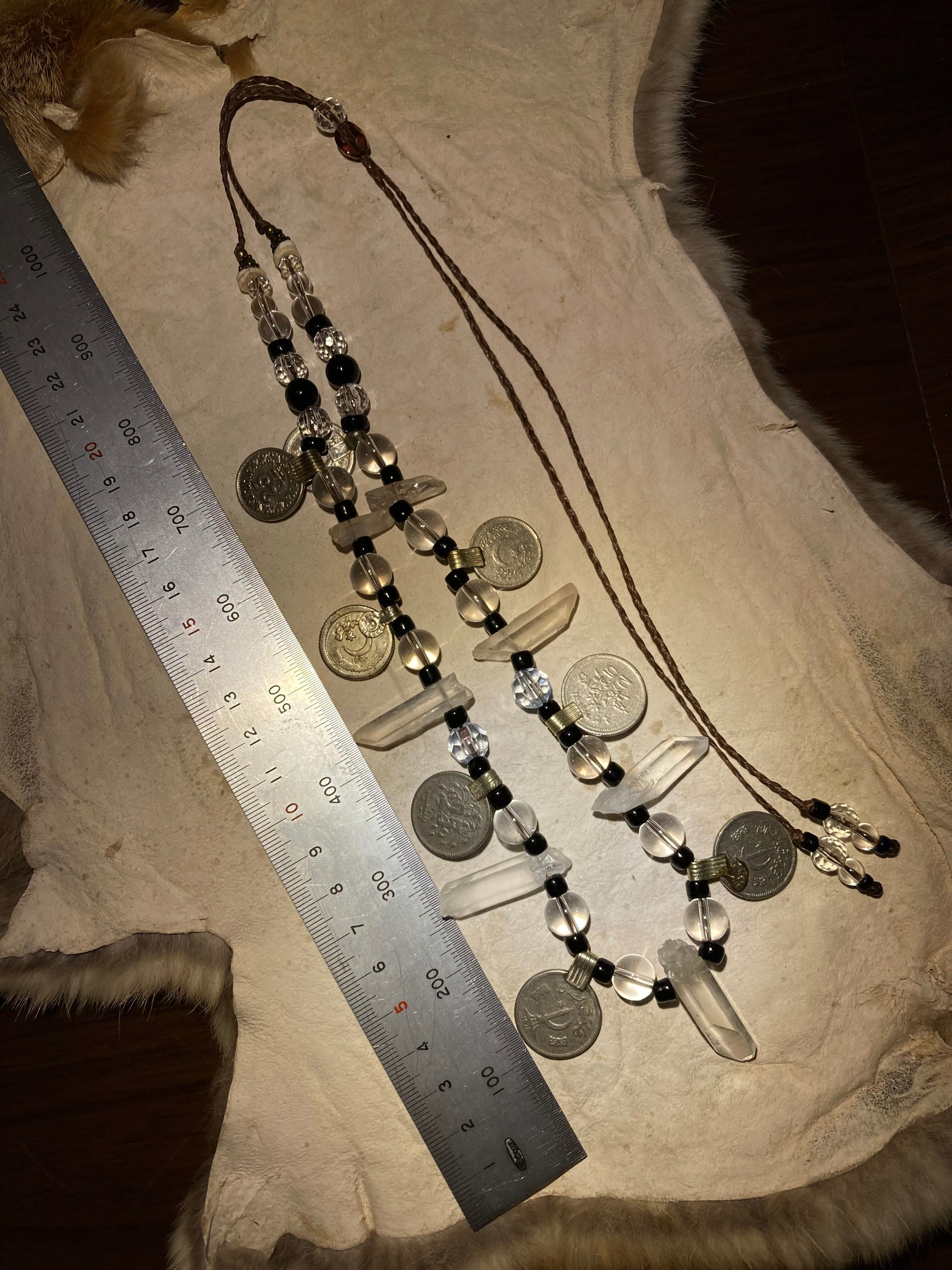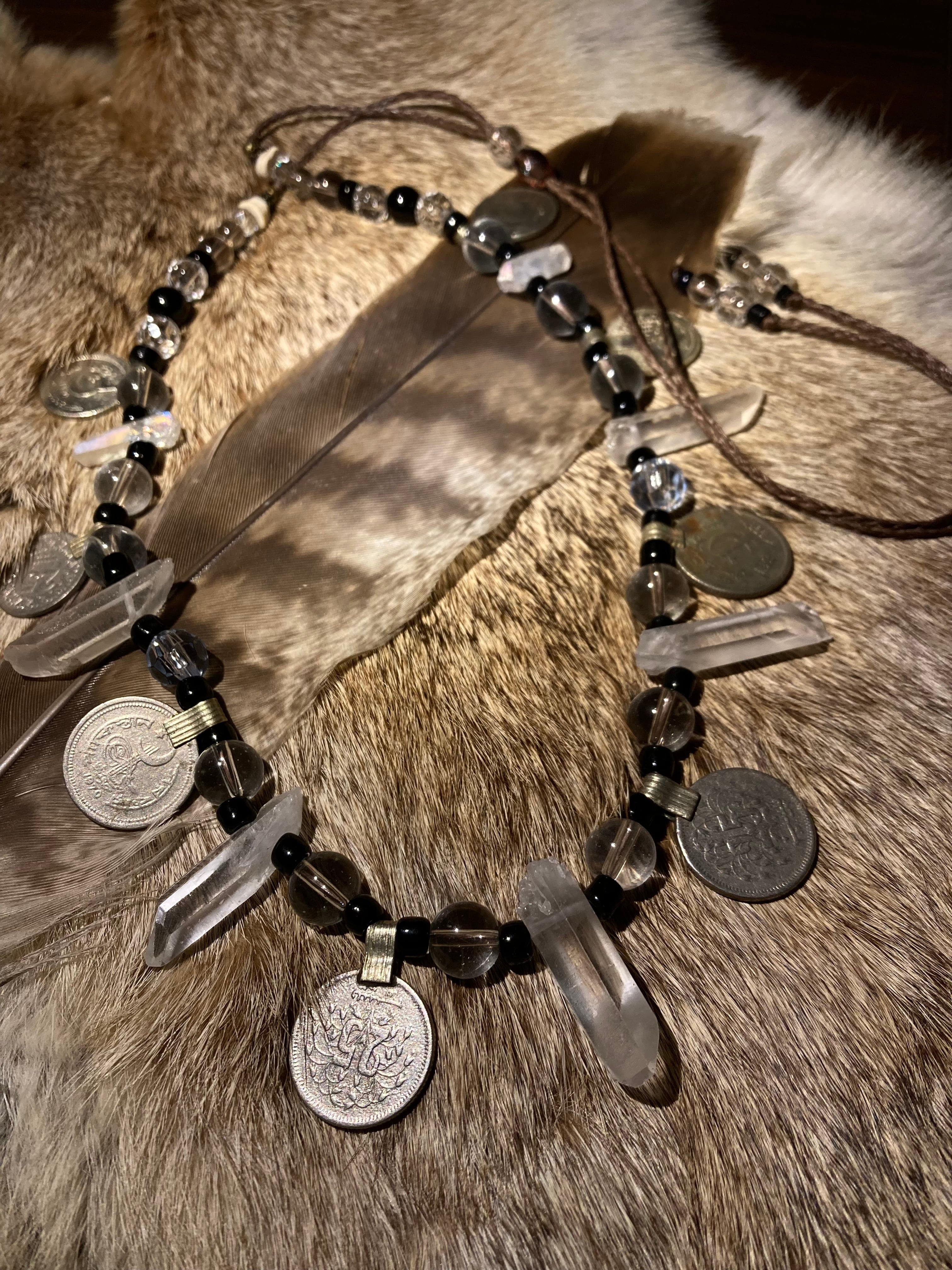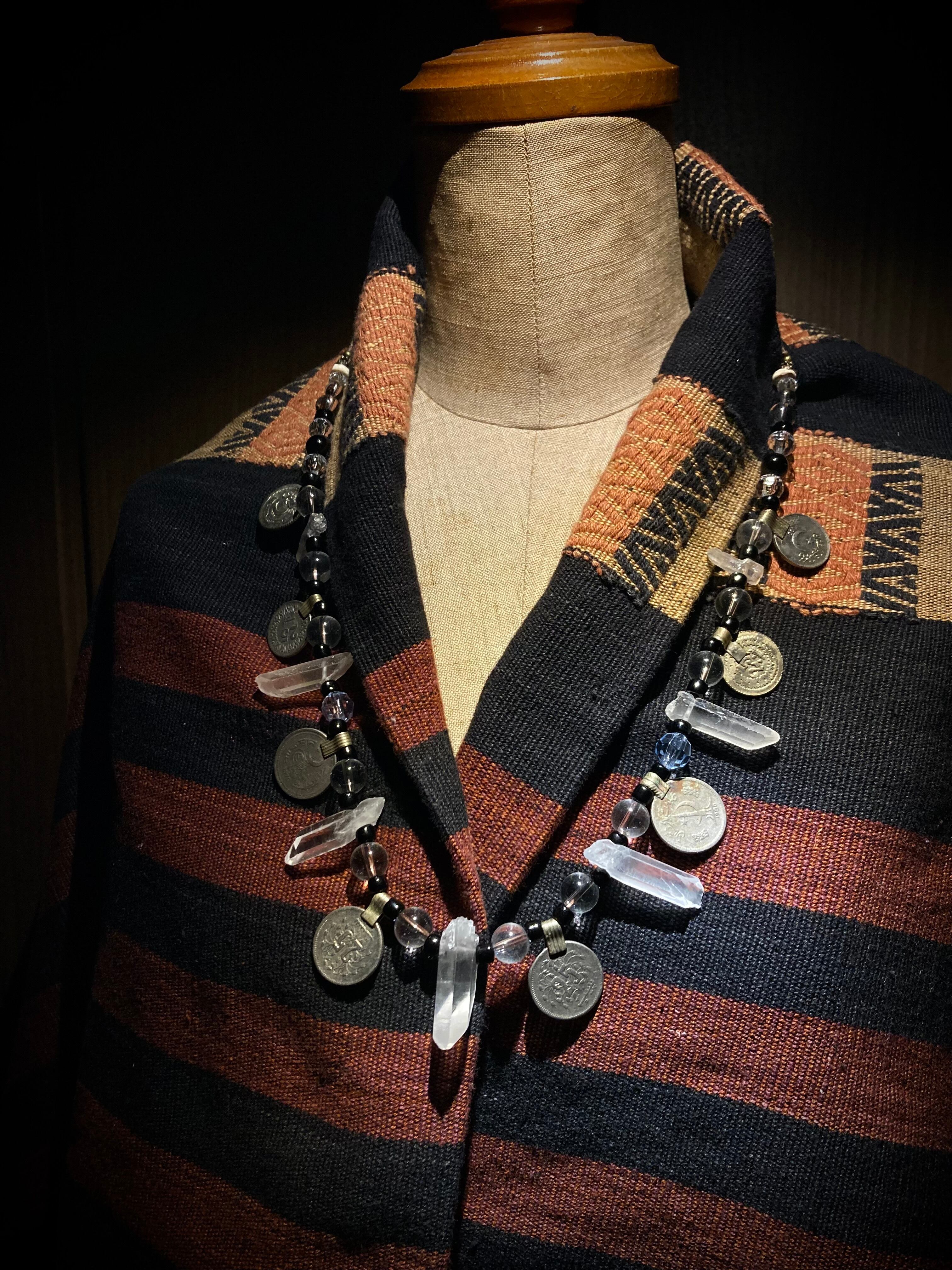水晶とオールドアフガニスタンコインをメインで製作したシックなトライバルネックレス作品。