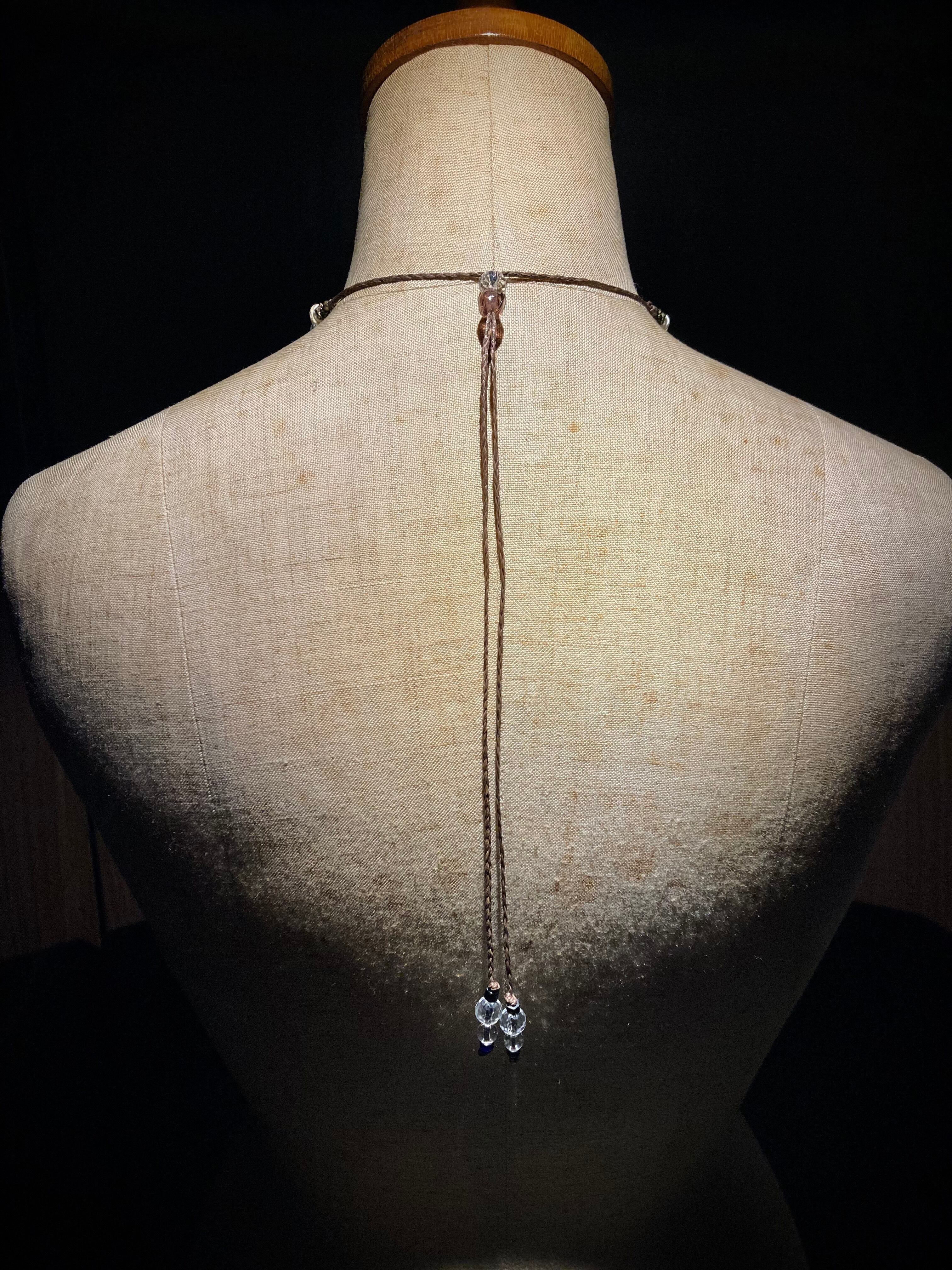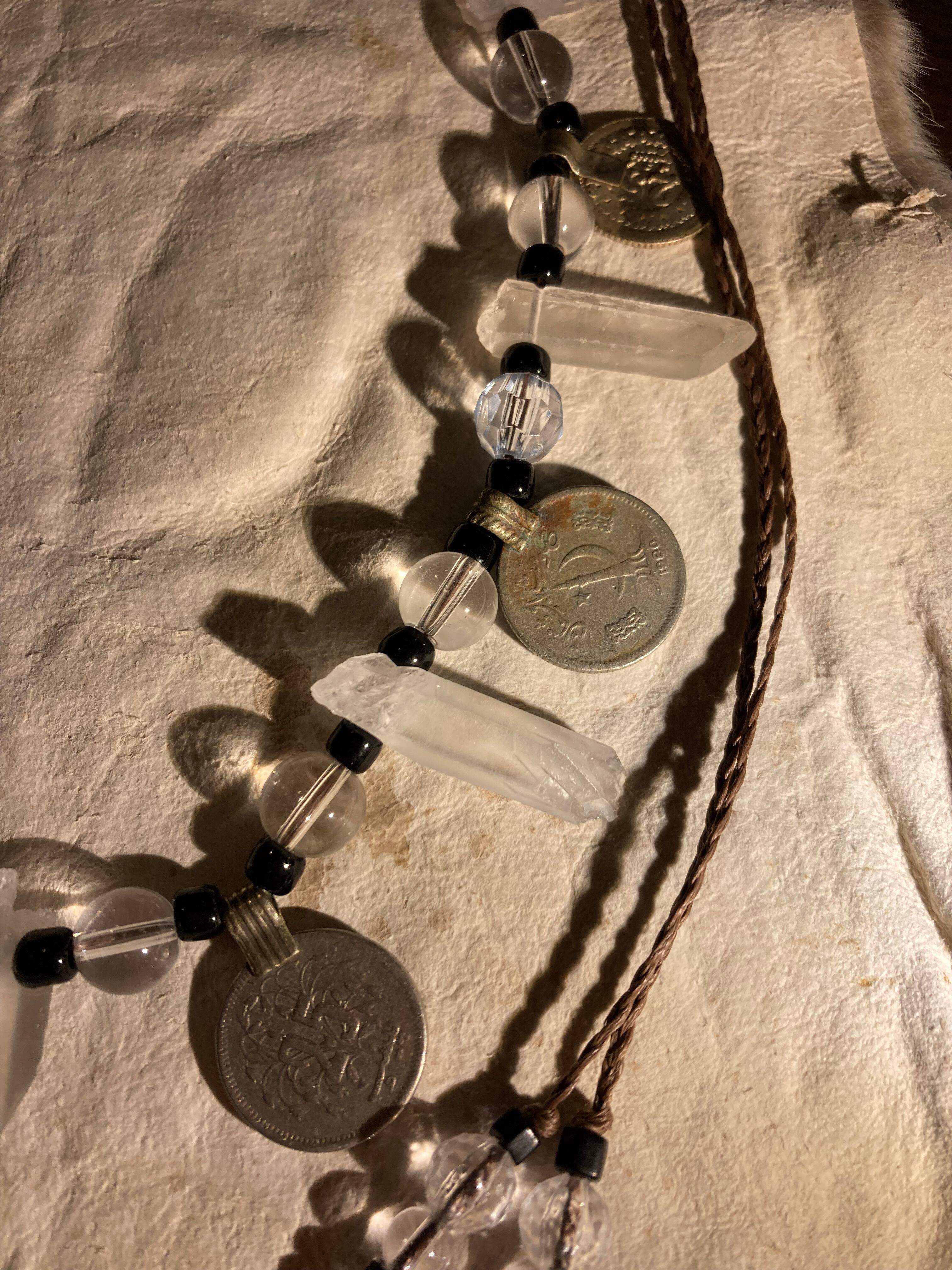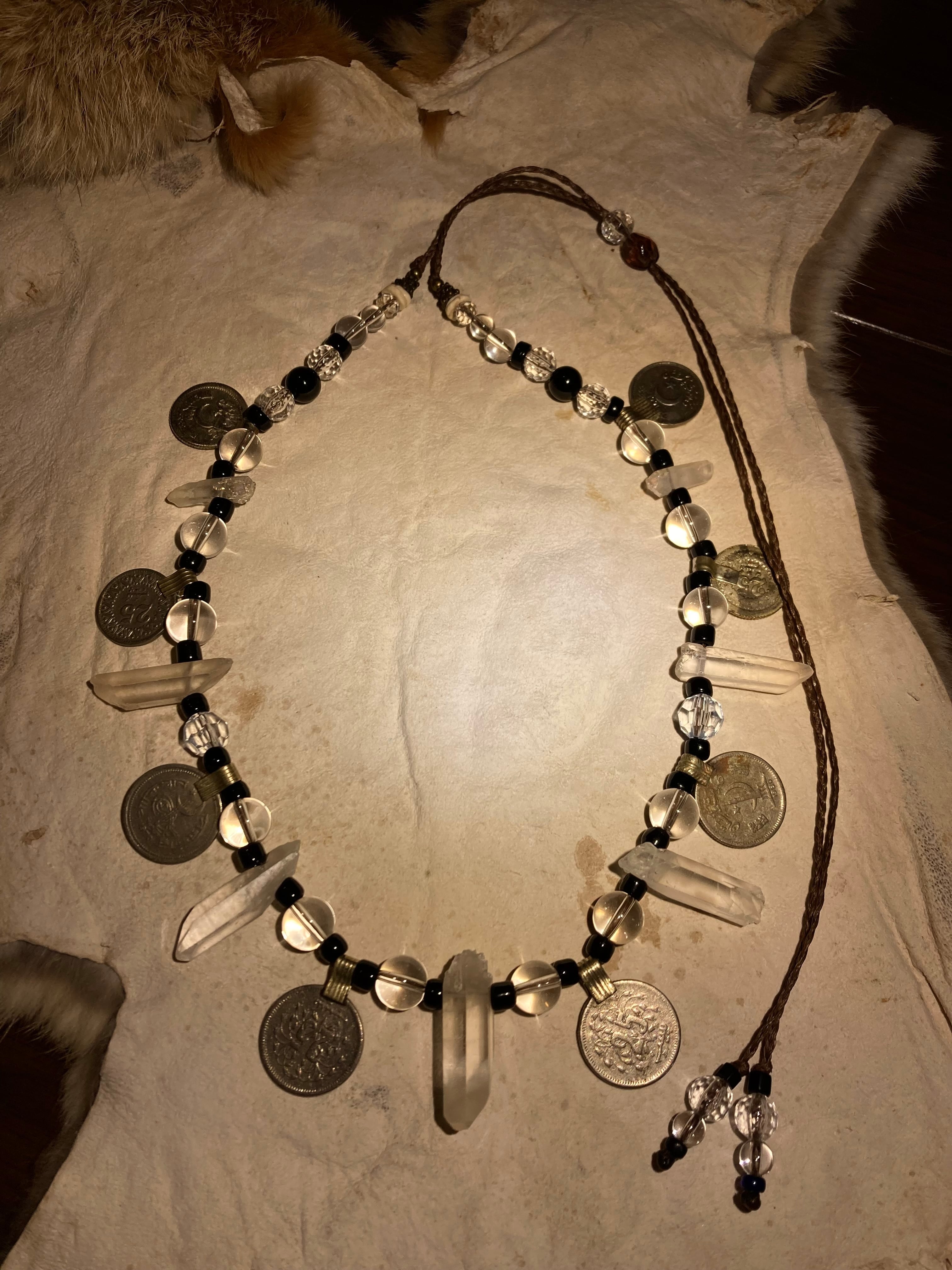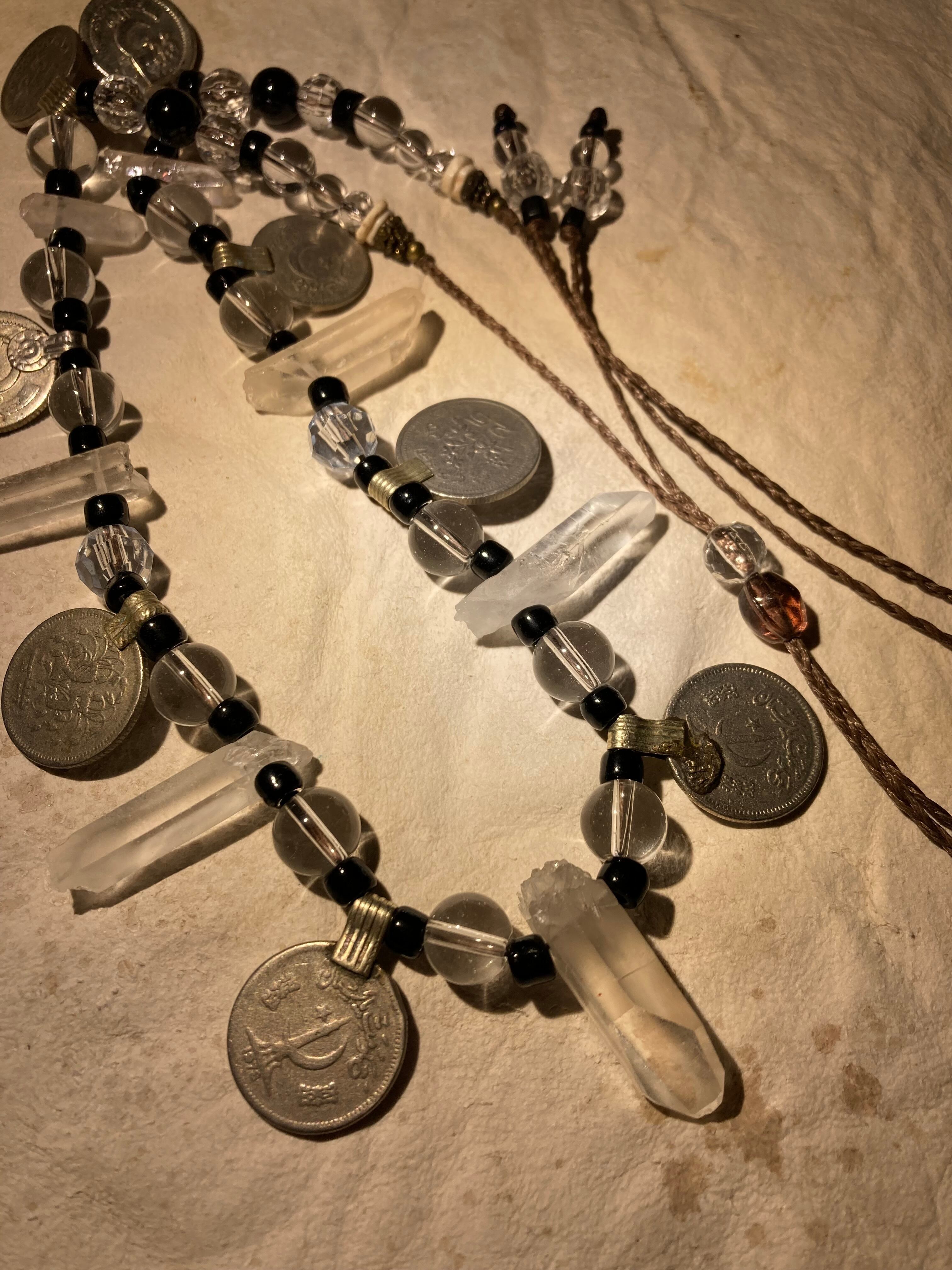 水晶とオールドアフガニスタンコインをメインで製作したシックなトライバルネックレス作品。
