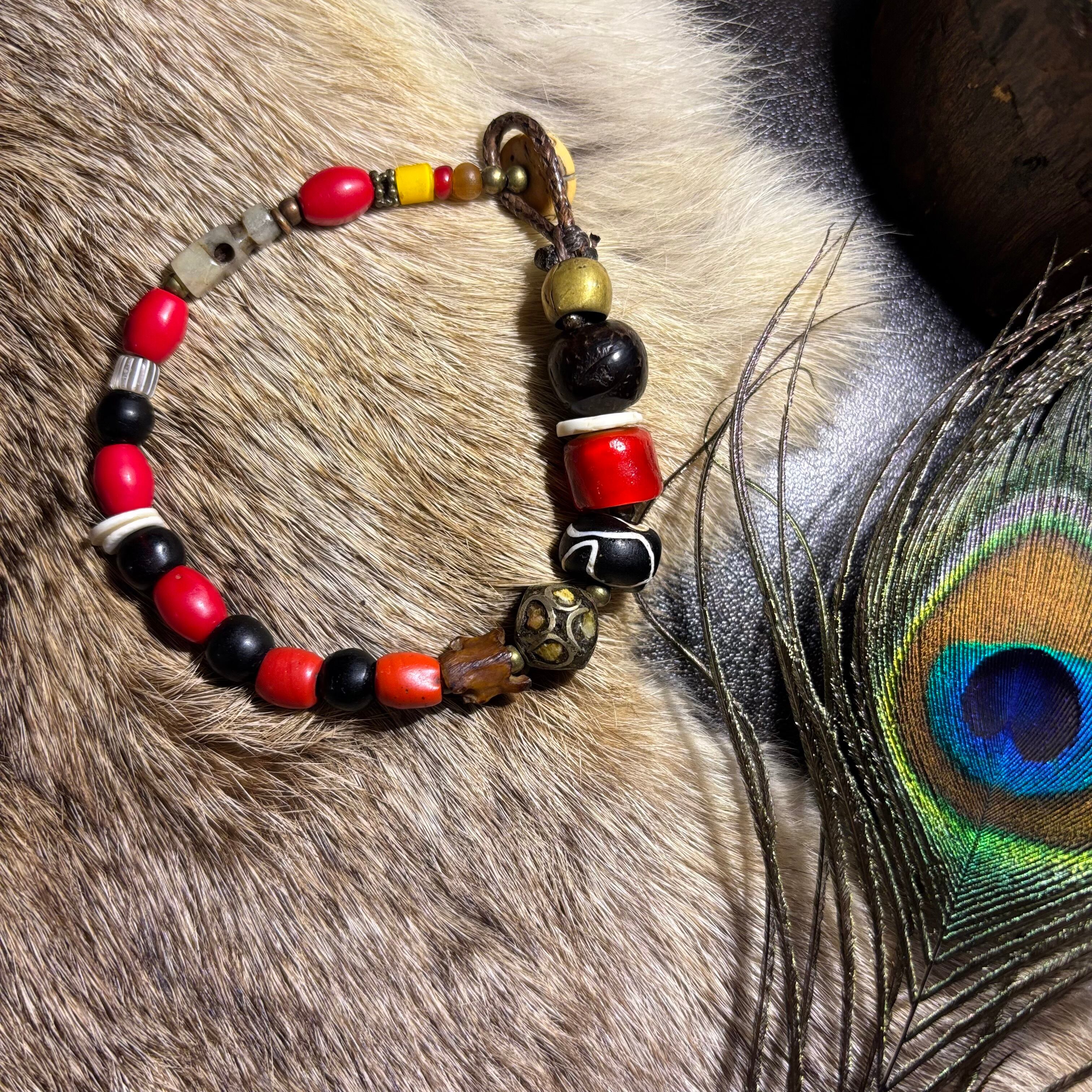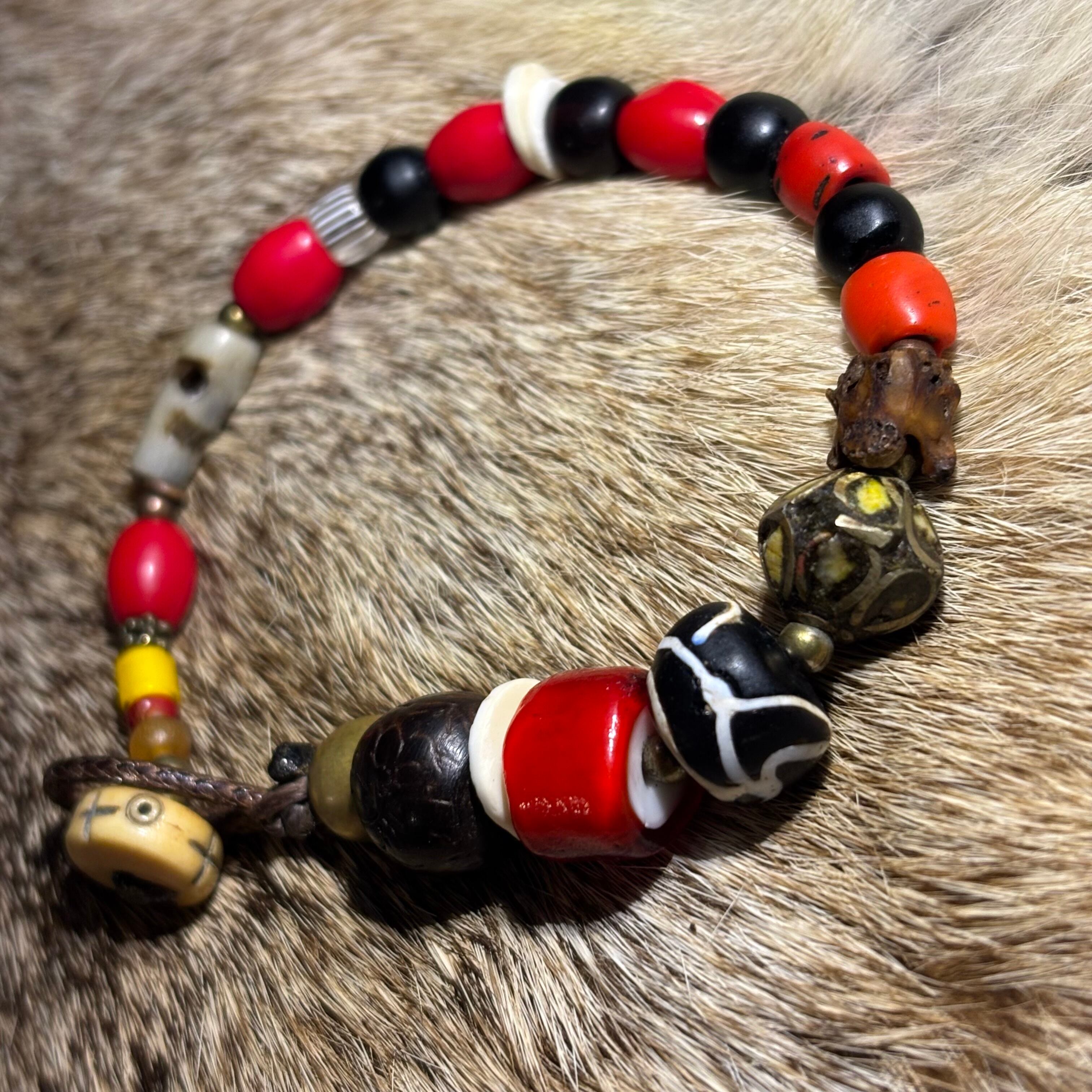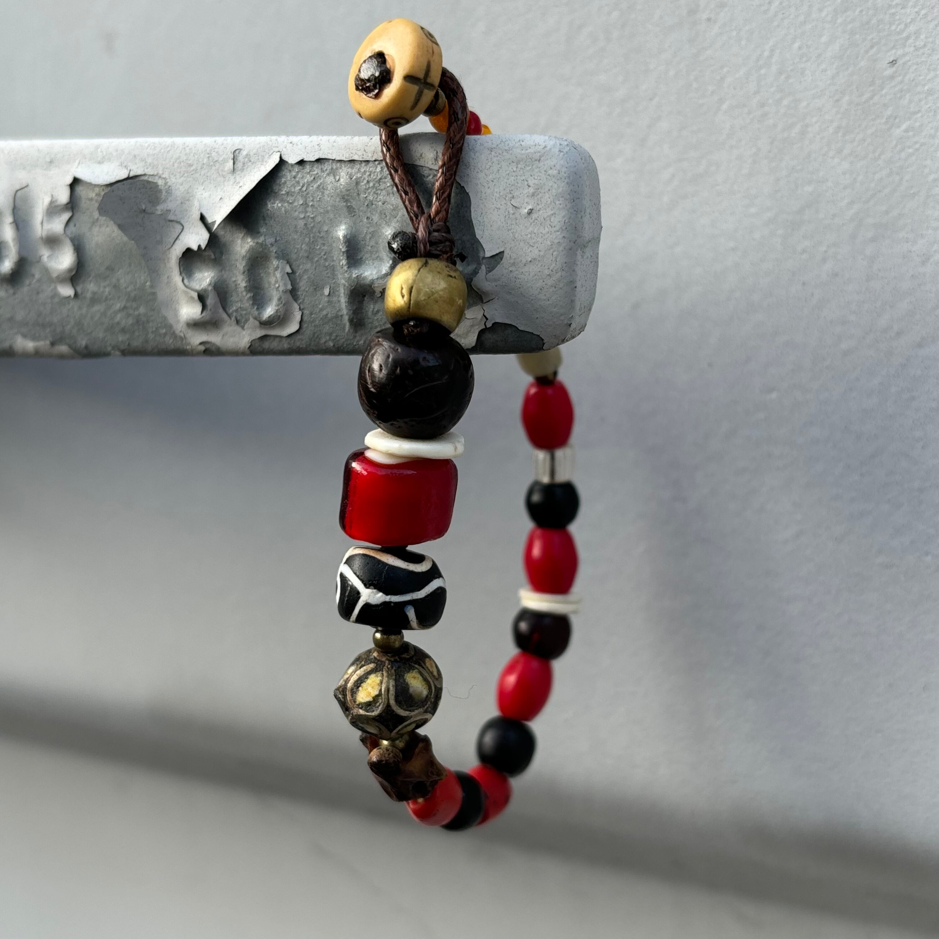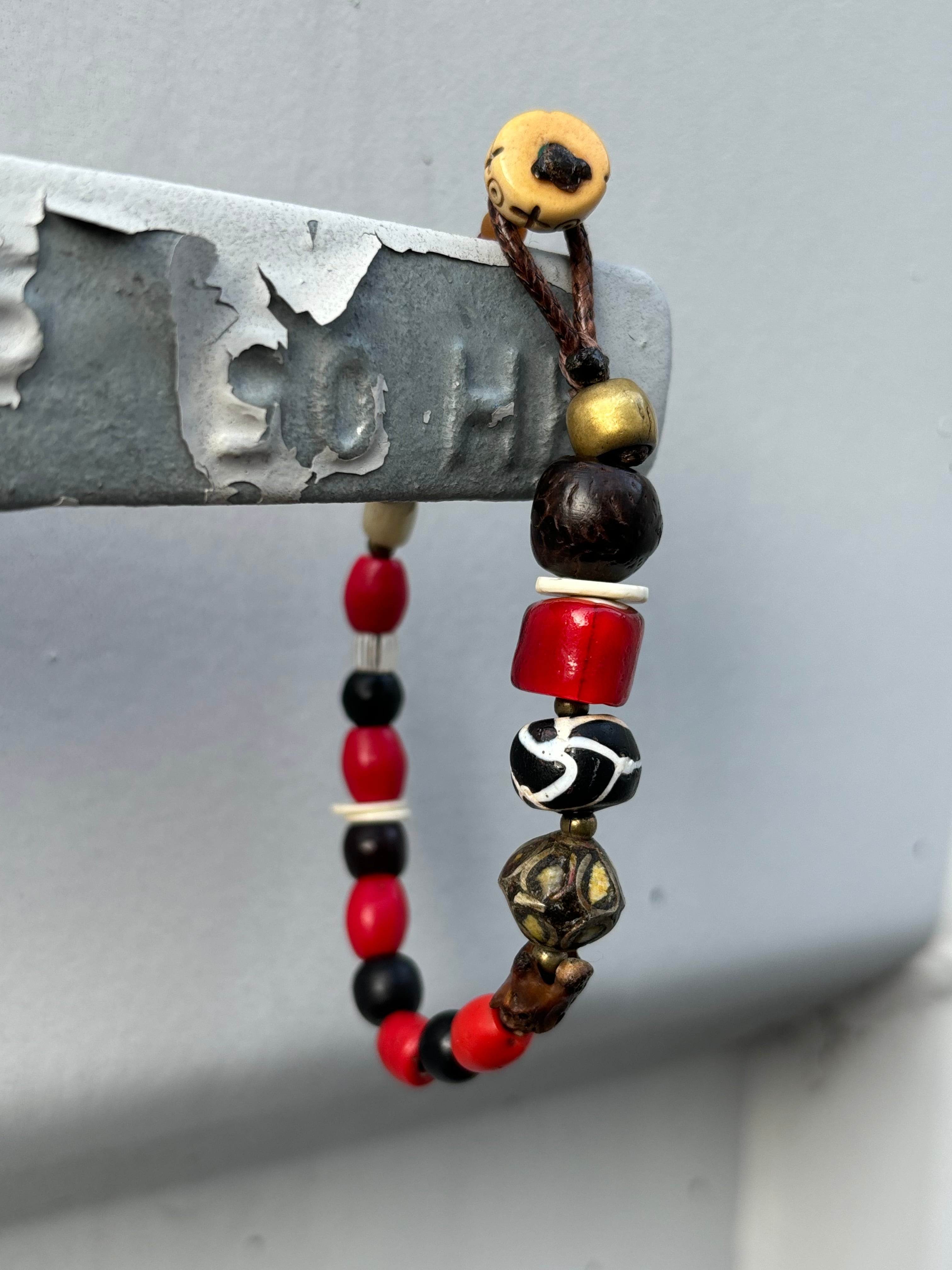 ベネチア産アンティーク特大ホワイトハーツにアンティークタマン族レッドオーバル型ビーズ、アフリカンアンティーク蛇骨、真鍮ビーズ、アンティーククリアオニオンスキンビーズ、留め具はビンテージヤクボーンビーズなどを仕様したトライバルブレスレット作品。